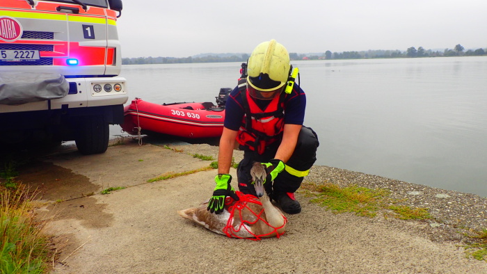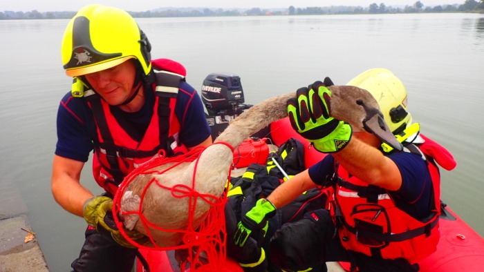 Jednotka Hasičského záchranného sboru Moravskoslezského kraje (HZS MSK) vyjela do Petrovic u Karviné zachraňovat poraněnou labuť v úterý 24.9. dopoledne, vybavena nafukovacím motorovým člunem Mark 3. Po šetrném chycení hasiči z labutě opatrně odmotali místy hluboko zařezaný silonový vlasec a převezli ji se zabodnutým háčkem na domovskou hasičskou stanici. Odtud si ji vyzvednul pracovník Záchranné stanice Bartošovice (pro volně žijící živočichy) a odvezl ji rovnou na operační sál na veterinární stanici.