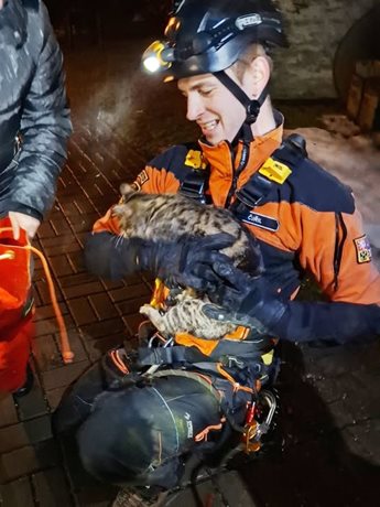Hasiči vyjížděli v noci k záchraně kočky, která uvízla vysoko ve stromě. Lezec ji bezpečně odchytil a předal zpět majitelce.