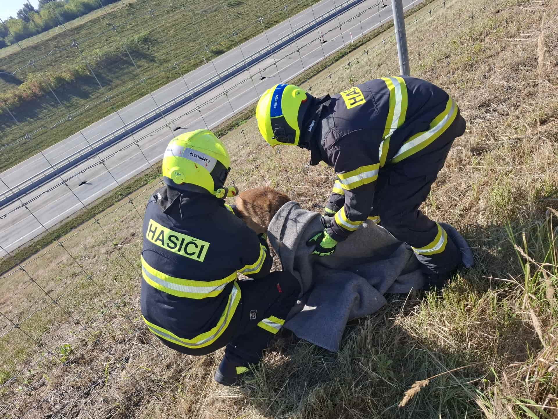Ráno zasahovali hasiči také u dálnice D1 u Přerova, kde srnka uvízla zadníma nohama v pletivu. Hasiči ji opatrně vysvobodili a pustili do volné přírody. Událost ukázala, jak rychlá a opatrná pomoc dokáže zachránit život zvířete a zabránit dalšímu ohrožení.