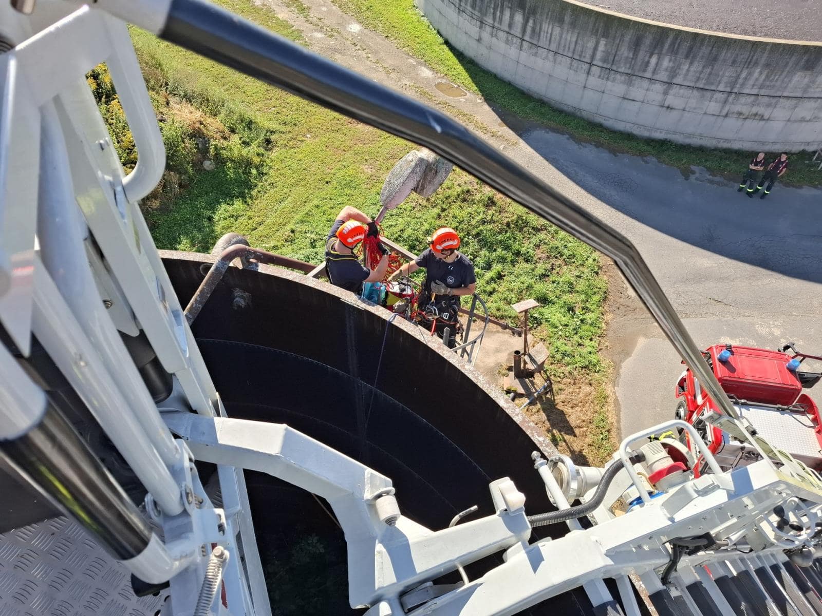 Na místo vyjeli dva hasiči-lezci, kteří se slanili na dno jímky vyzbrojeni dřevěnými deskami, aby nezapadli do mazlavého materiálu. Čápa postupně obklíčili, zabalili do deky a pomocí lanových technik dostali na obrubu nádrže. Odtud jej v koši automobilového žebříku přenesli na pevnou zem, kde byl vypuštěn do volné přírody bez zranění.