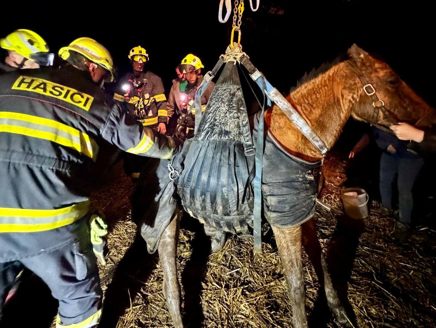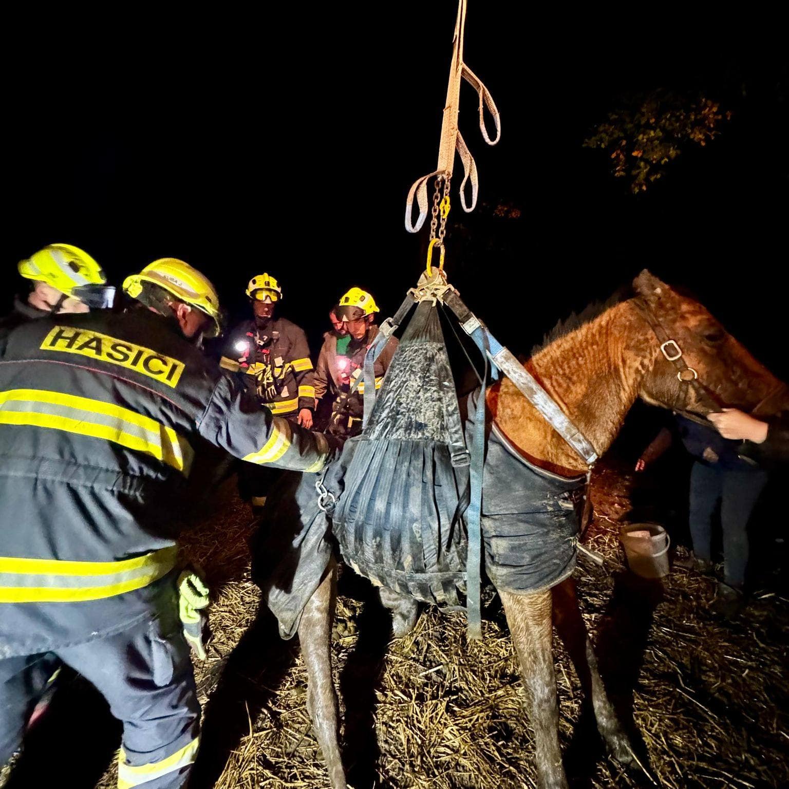 Hasiči nejprve zvíře zafixovali a následně využili automobilový jeřáb, který běžně slouží pro technické zásahy. Pomocí popruhů koně šetrně nadzvedli a postavili na nohy. Akce proběhla koordinovaně pod dohledem přivolané veterinářky, která zvíře po zvednutí vyšetřila.