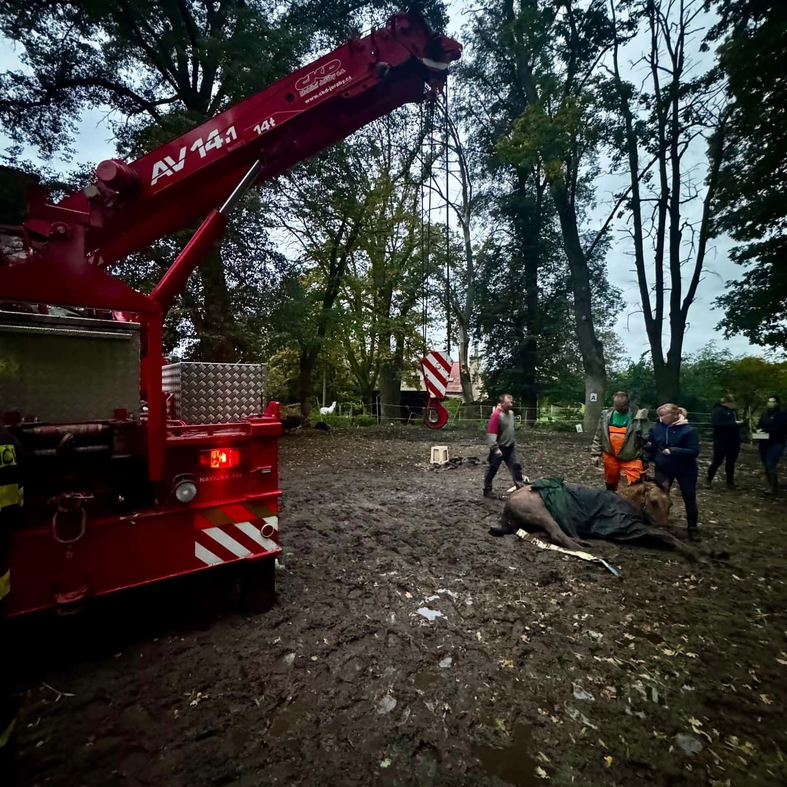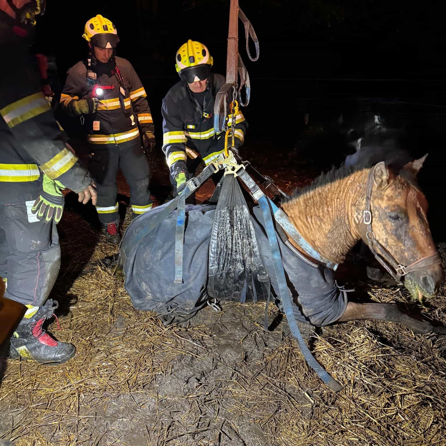 Kůň zůstal ležet bez sil: Hasiči ho s pomocí jeřábu postavili na nohy