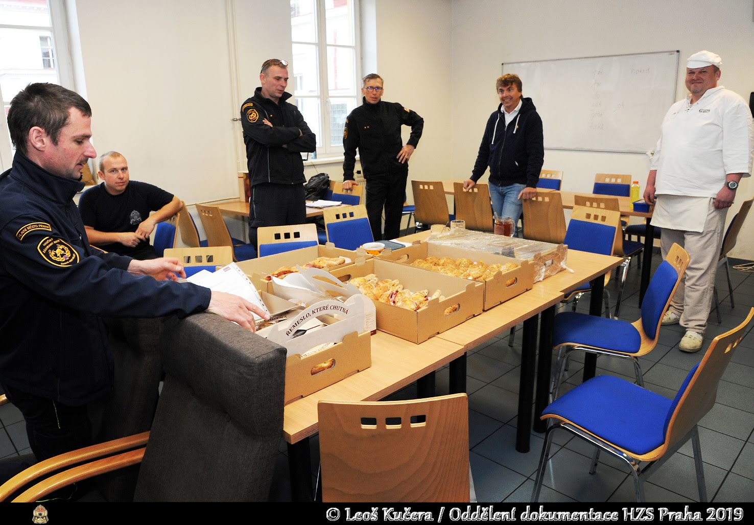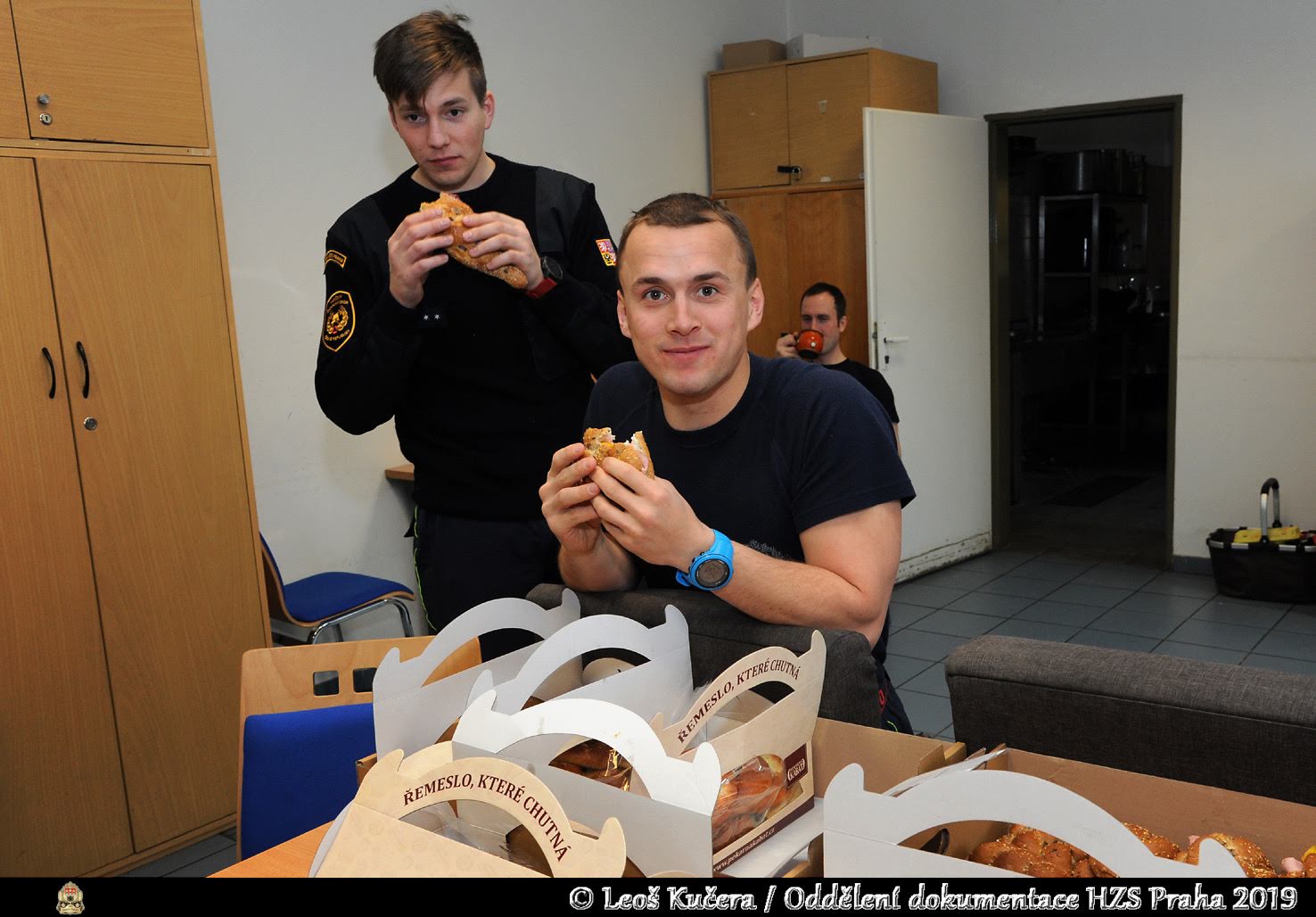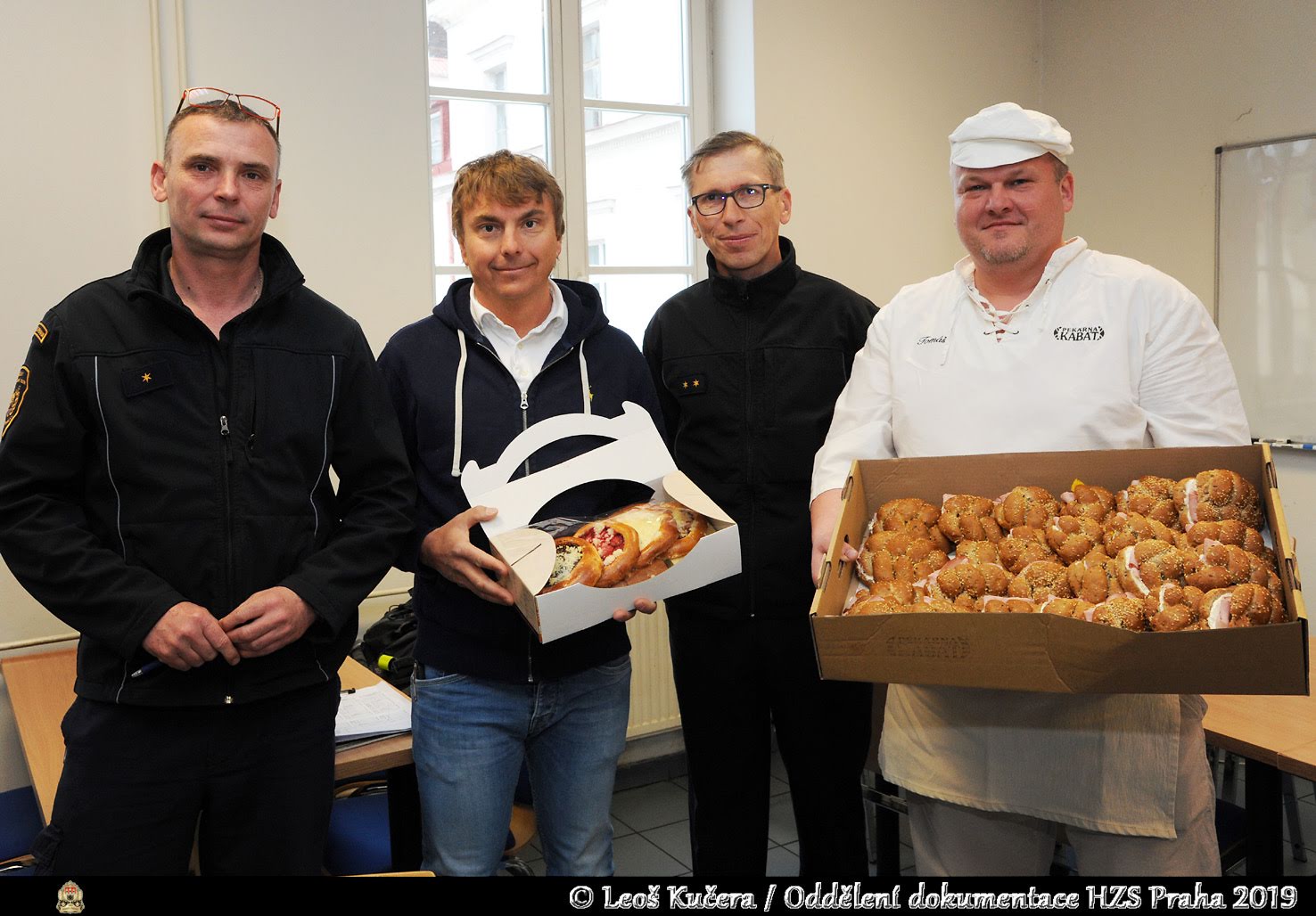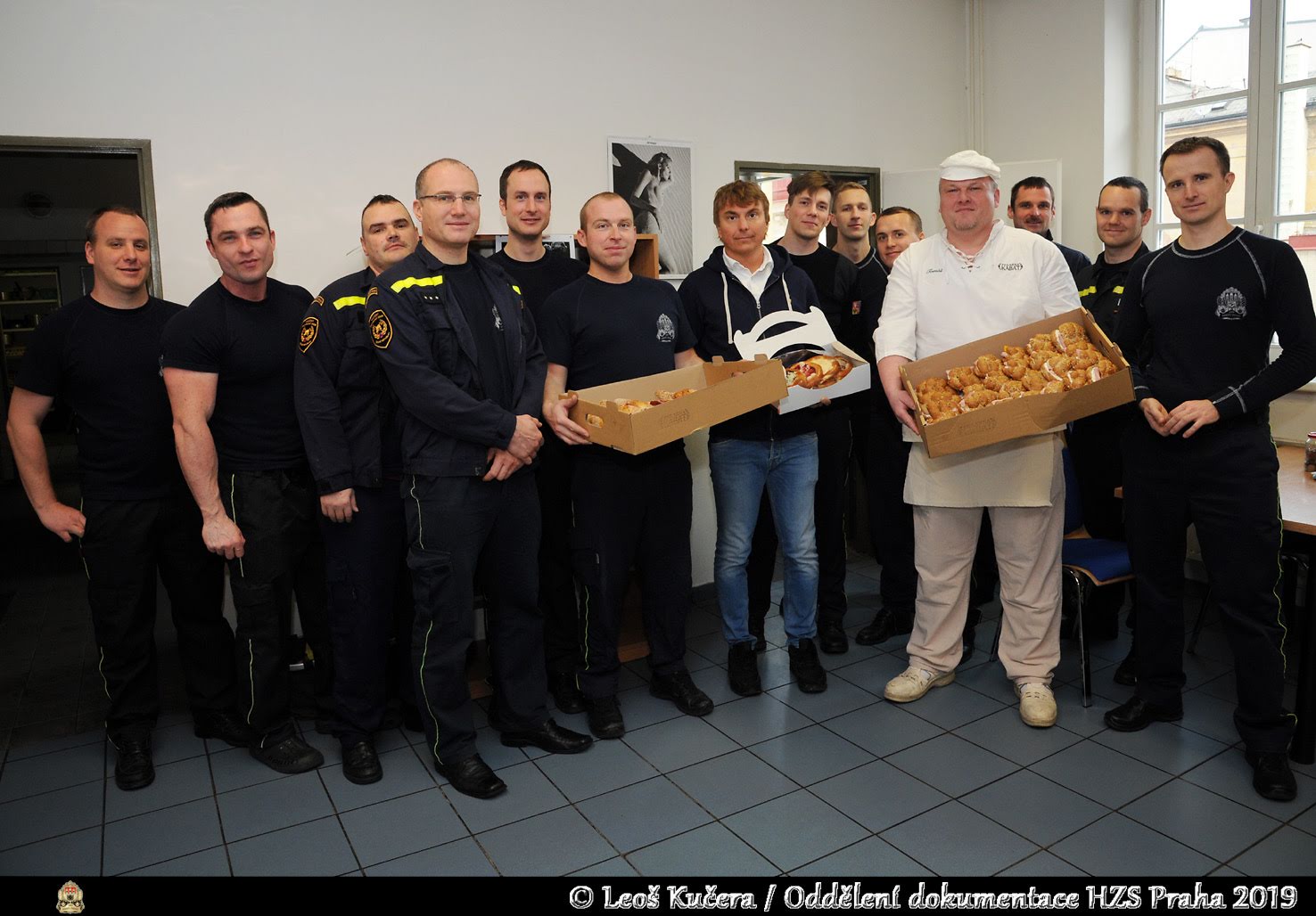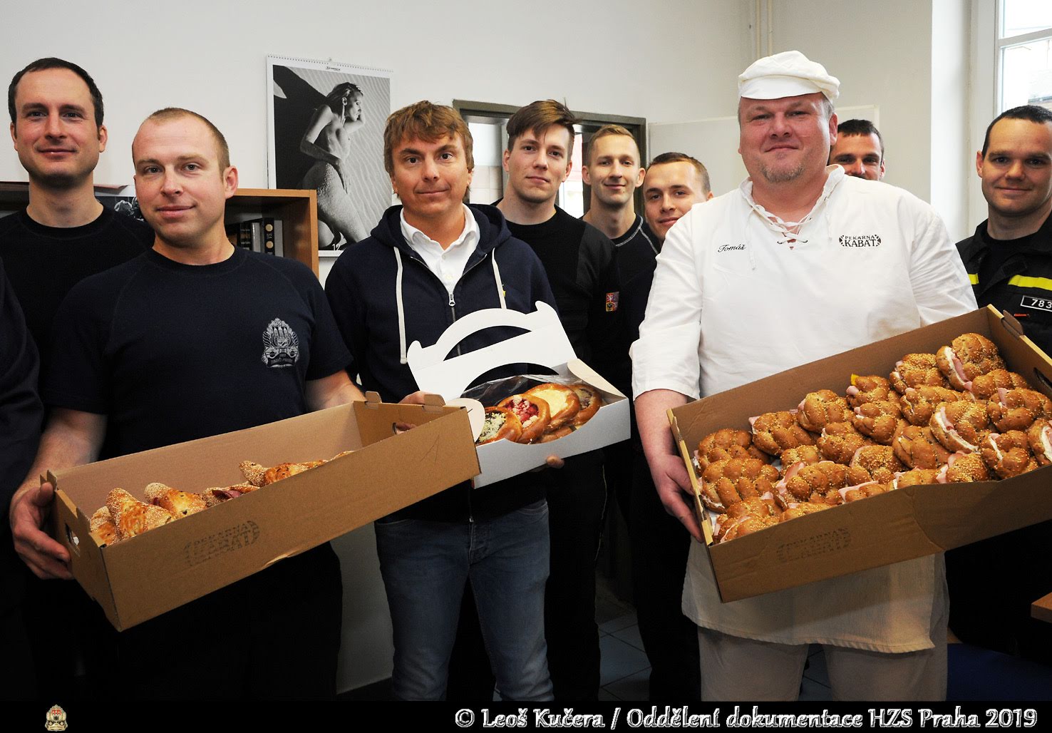 Zasahujícím hasičům HZS Praha ze směny B v pondělí 1. dubna 2019 poděkovali majitelé firmy Kabát a osobně se s hasiči setkali na třech stanicích.