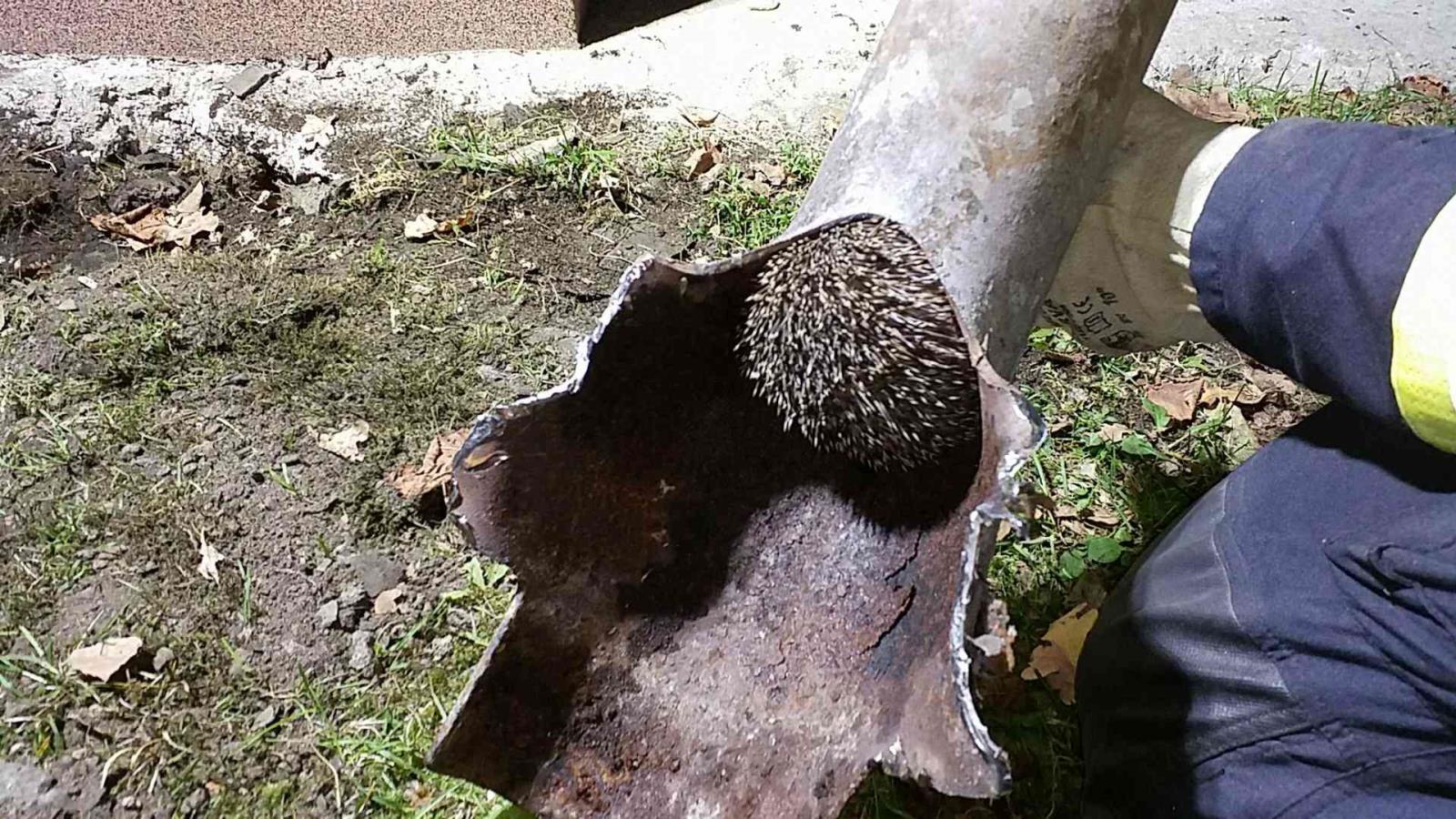 Jednalo se o záchranu ježka s mládětem z roury, ze které se nemohli dostat ven. Nejdříve do trubky spadlo mládě a za ním pravděpodobně jeho matka.