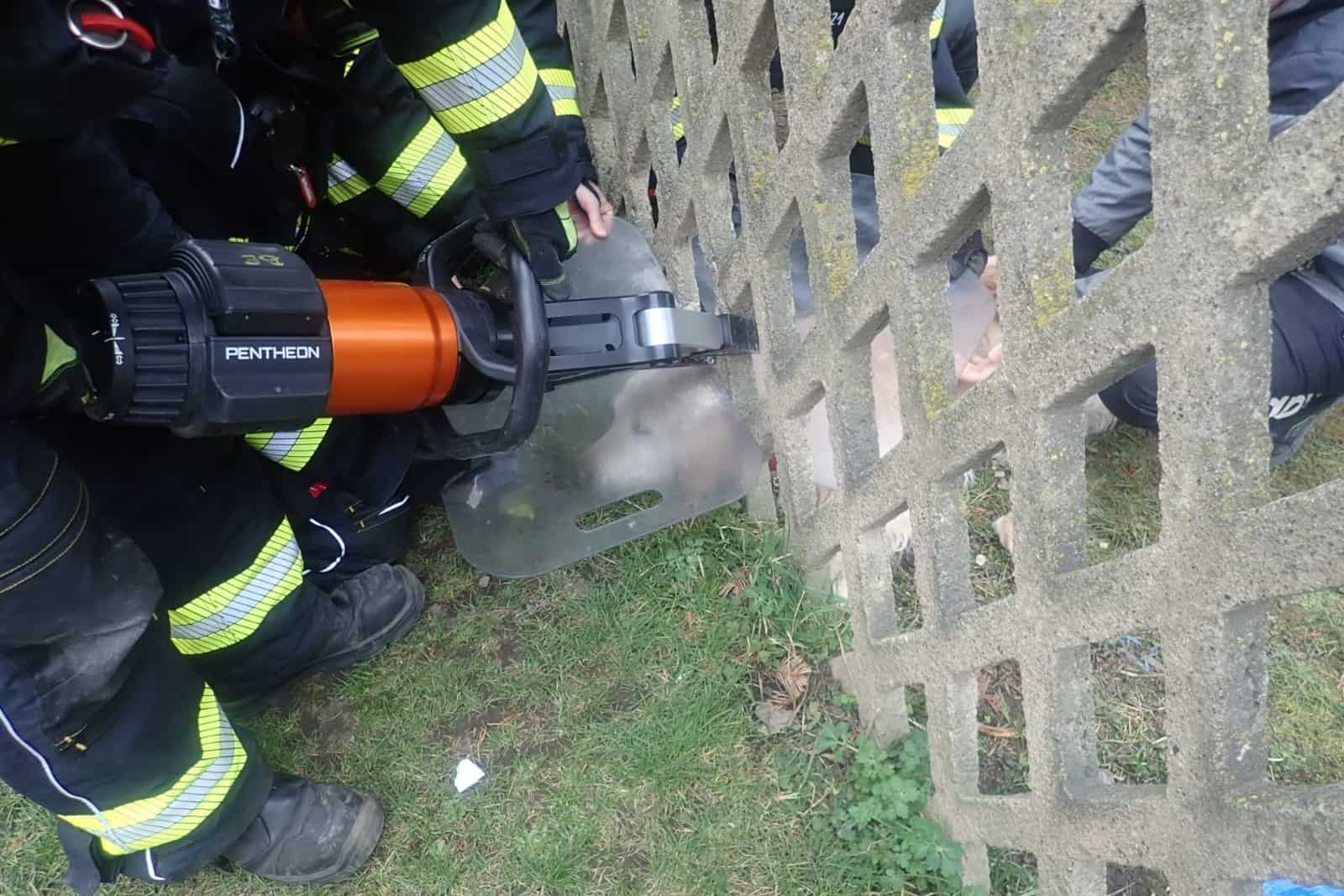 Hasiči po příjezdu situaci pečlivě vyhodnotili a rozhodli se pro šetrný postup. Během zásahu psa chránili ochrannými štíty, aby ho případné úlomky betonu nemohly zranit. Následně použili akumulátorový vyprošťovací rozpínák, kterým opatrně odlomili jeden dílek betonového plotu.