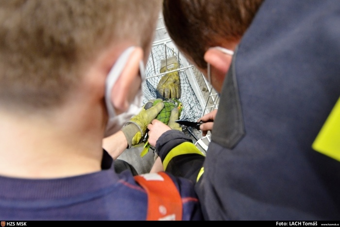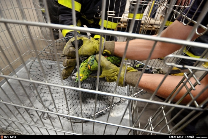 Ke slovu přišel „ptačí“ podběrák a teleskopické tyče k plašení, aby si uprchlík sedl na odlovitelné místo. Trpělivost hasičů z HZS Moravskoslezského kraje, specialistů na podobné zásahy s faunou, nakonec po více než půlhodině nahánění zvítězila nad pokusy tohoto papouška (který se v přírodě vyskytuje od Mexika po Jižní Ameriku) nenechat se v členitém prostředí budovy chytit.