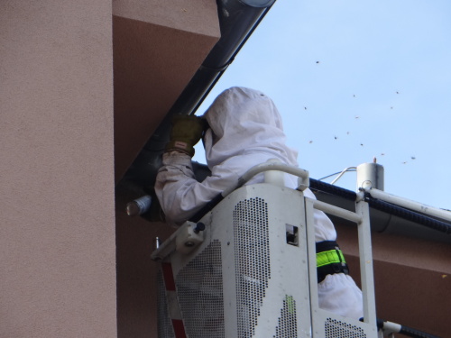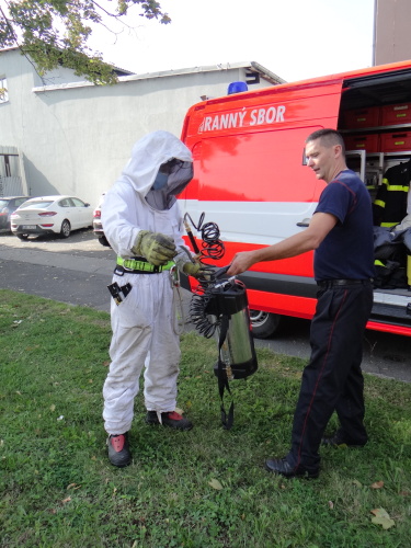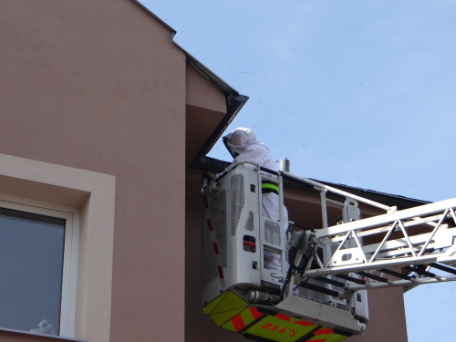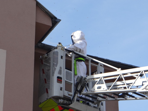 V koši žebříku se nechal vyvézt hasič ve speciální bílé kombinéze s kuklou, u sebe měl zařízení na efektivní aplikaci jedu proti hmyzu. Jed stříkal několik minut do úzkého otvoru vosího hnízda. Některé rozzuřené vosy kolem něj létaly, protože jed působí pomalu, ale jistě.