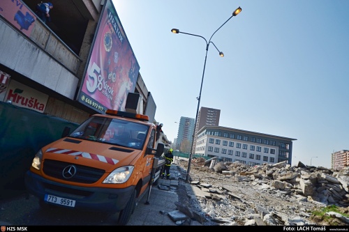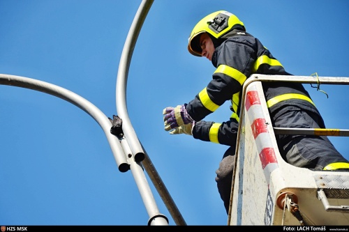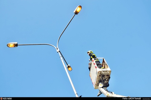Protože sloup se nachází na staveništi, kde se rekonstruuje zdejší velké náměstí, museli hasiči vzít zavděk automobilovou plošinou Ostravských komunikací, hasičská výšková technika by totiž nebyla schopna četné výmoly proojet. A na nastavovací žebříky to bylo příliš vysoko.