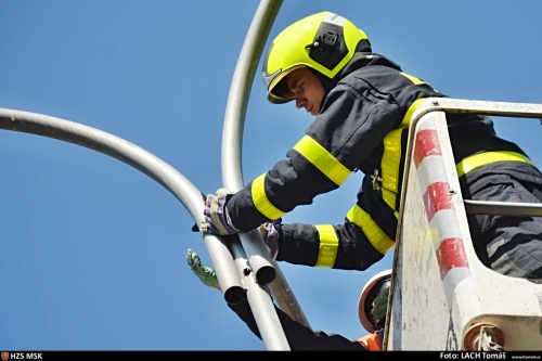 Profesionální hasiči z Ostravy-Přívozu (HZS MSK) zachraňovali v úterý 16.4.2019 dopoledne v Ostravě-Hrabůvce kavku, která se zasekla v horní části sloupu veřejného osvětlení v Horní ulici, a to mezi třemi rameny, držícími samotná světla.