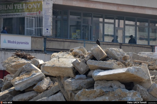 Spokojená kavka se nakonec uvelebila na zbytcích vysekaných betonových kvádrů a v naprostém klidu zvědavě pozorovala, co že se to s tím jejím oblíbeným náměstím děje podivného.