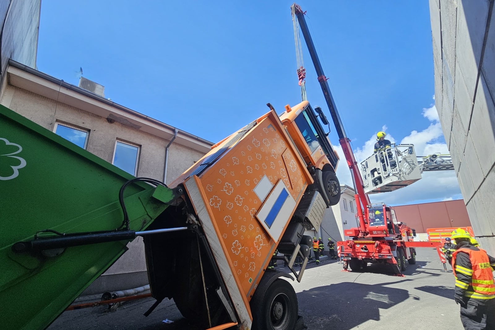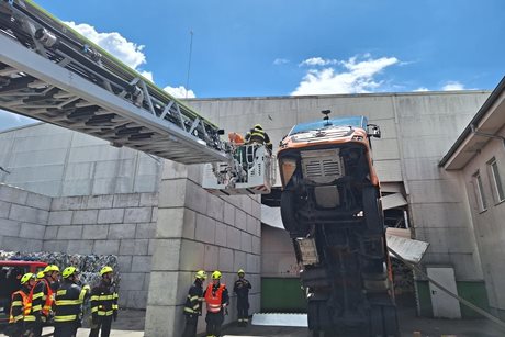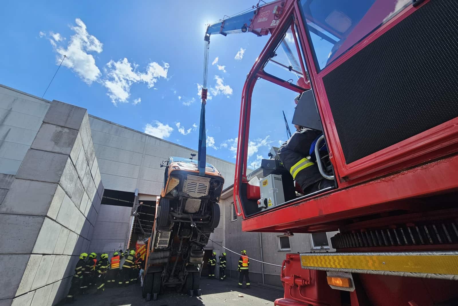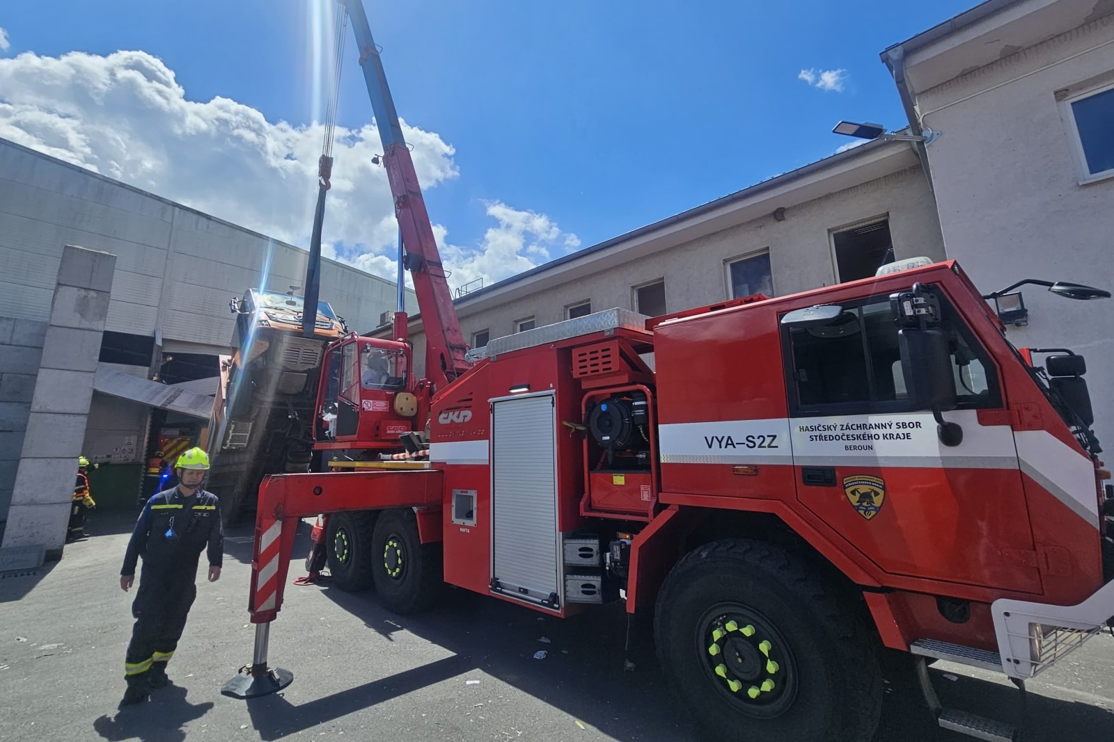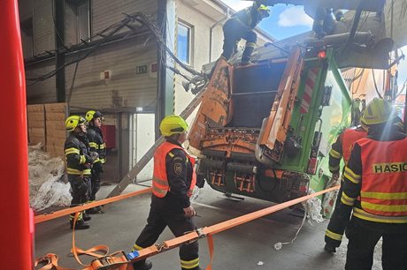 Výjimečný zásah čekal hasiče v Chrášťanech u Prahy, kde se sběrný vůz na papír převážil při výjezdu z haly a zůstal stát téměř kolmo. Řidič uvízl v kabině ve výšce několika metrů a musel být zachráněn pomocí výškové techniky.