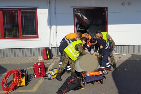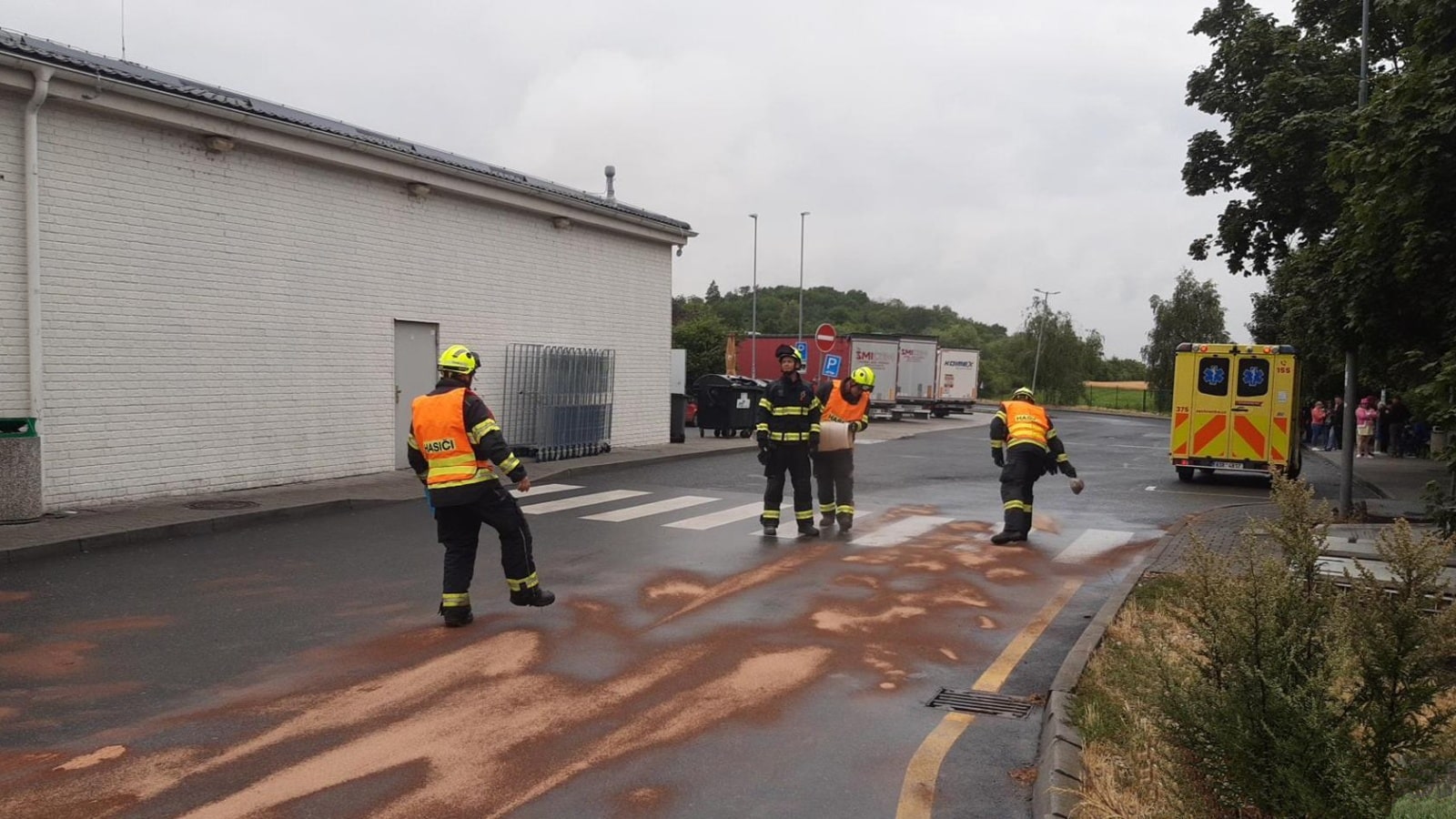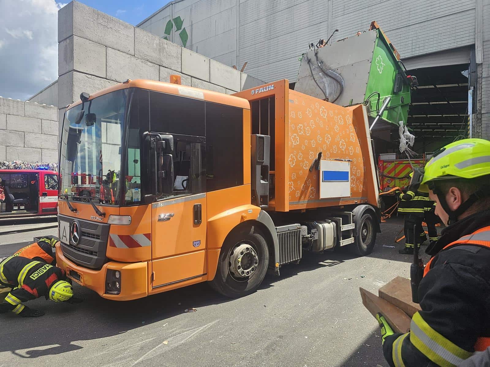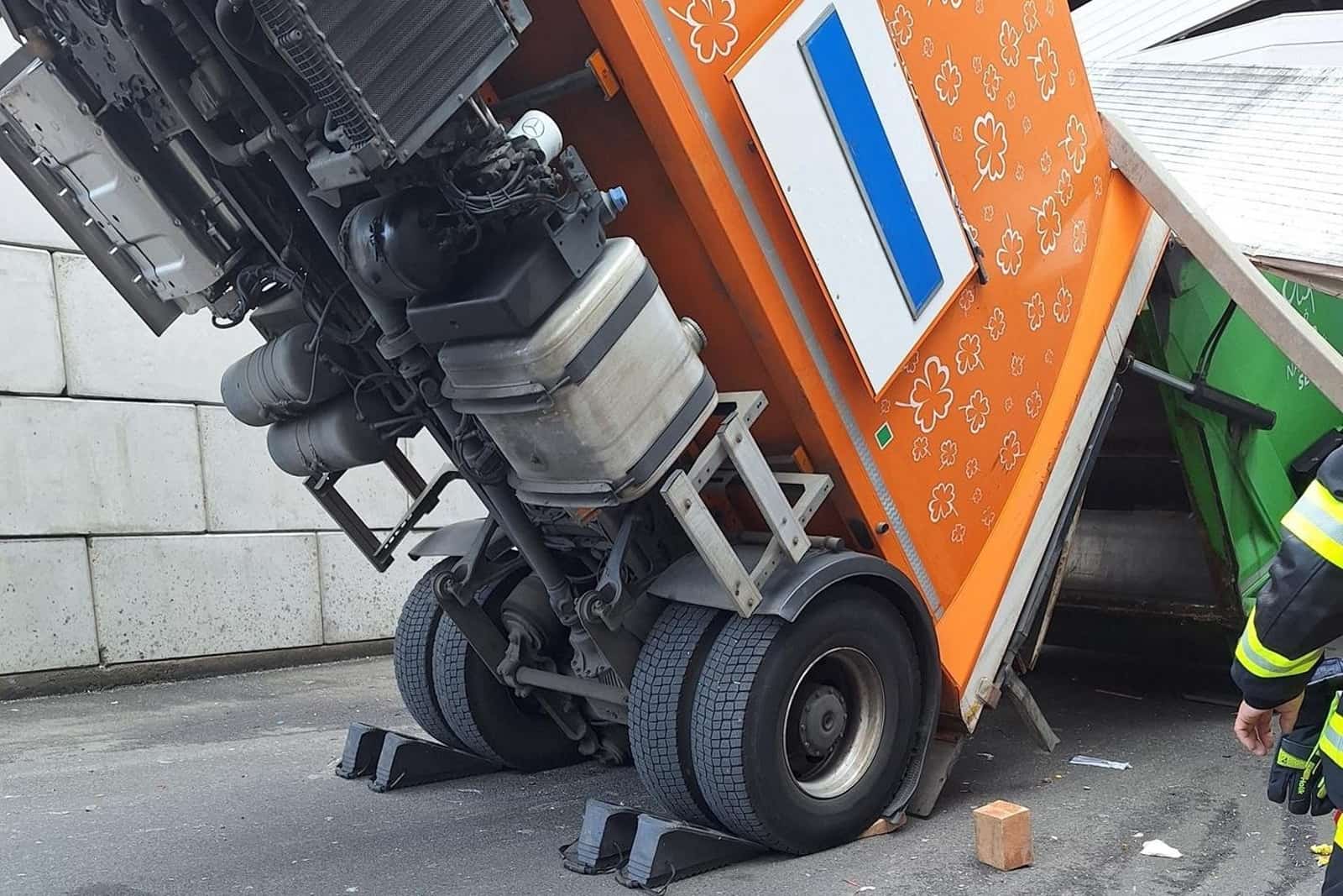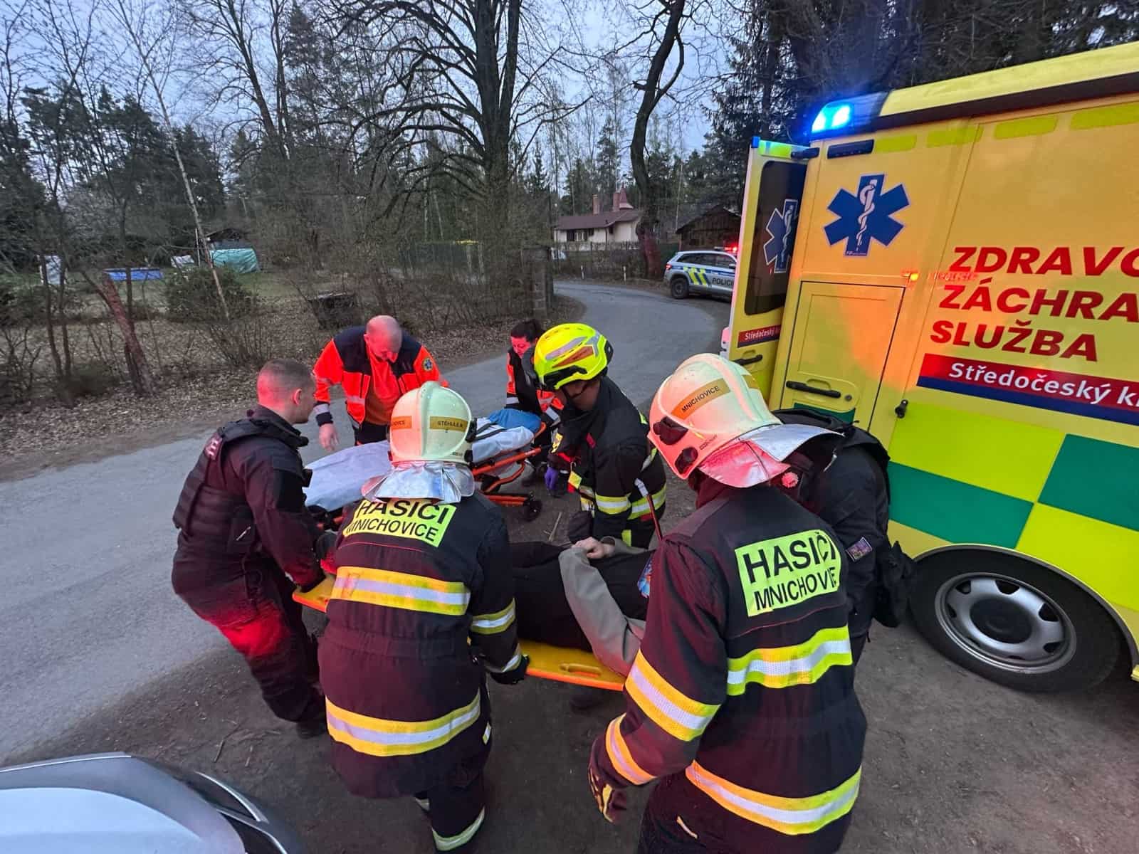 Výjimečný zásah čekal hasiče v Chrášťanech u Prahy, kde se sběrný vůz na papír převážil při výjezdu z haly a zůstal stát téměř kolmo. Řidič uvízl v kabině ve výšce několika metrů a musel být zachráněn pomocí výškové techniky.