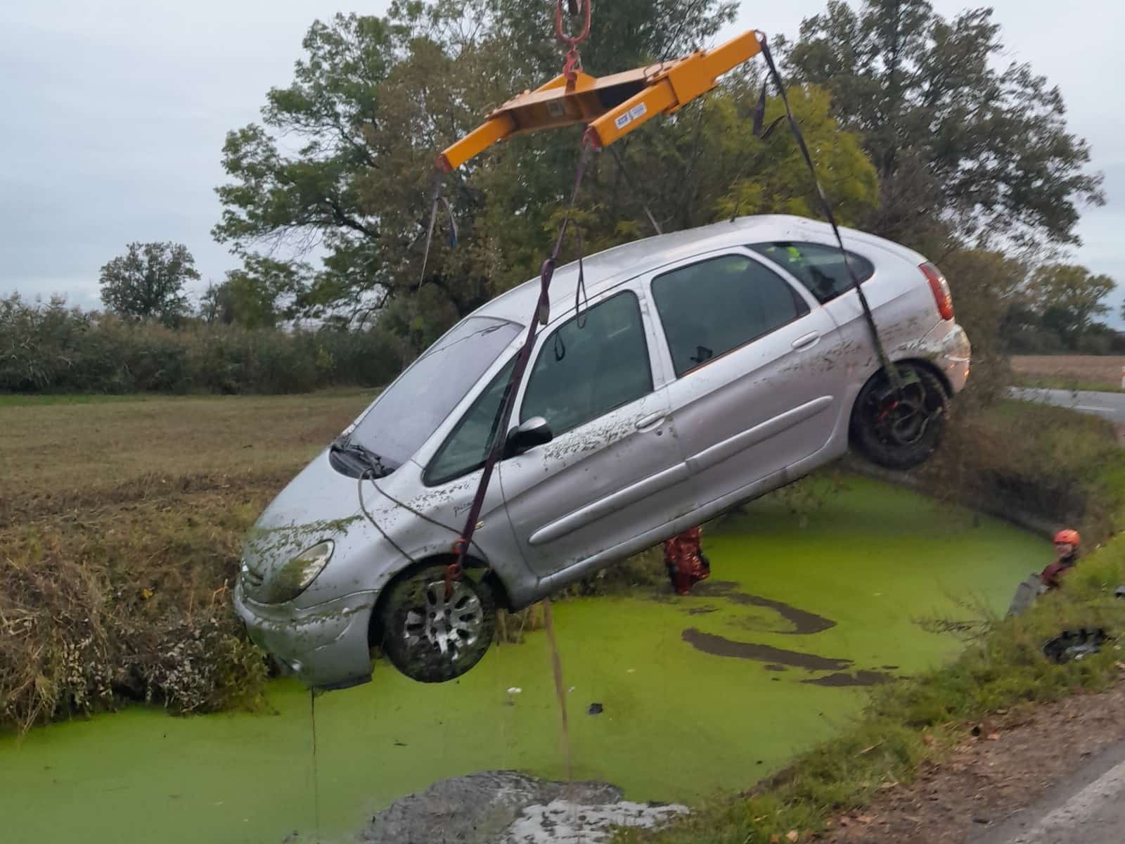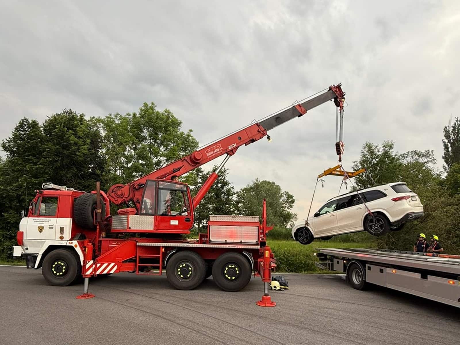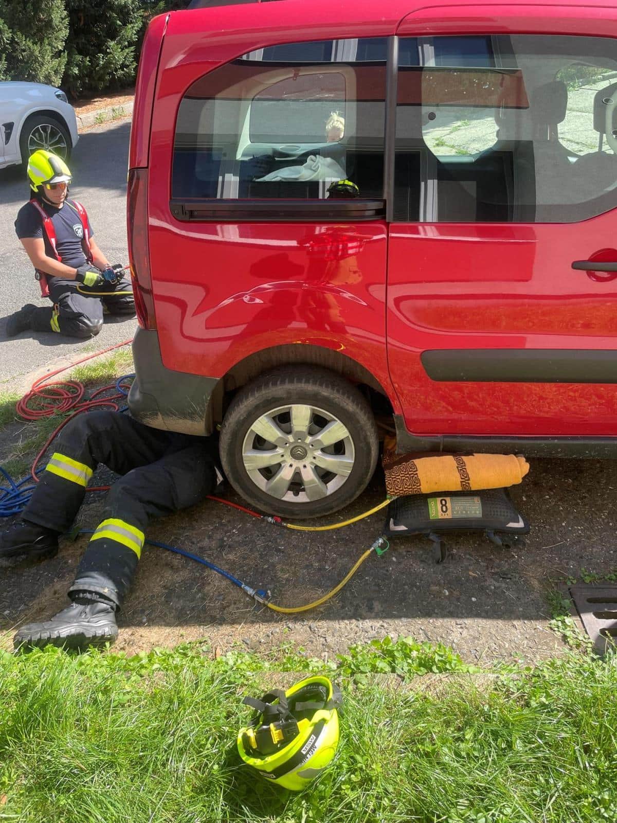Redakce psala v článku: Kuriózní nehoda v Chrášťanech jednotka hasičů vyprošťovala visící vůz při neobvyklém zásahu IZS
