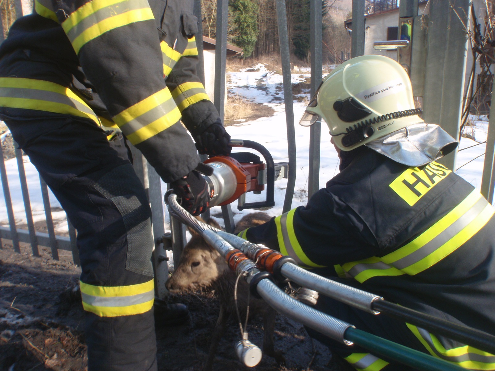K vyproštění srnky, která se zasekla v plotě v blízkosti lesní školky na ulici U Revíru, hasiči použili hydraulické vyprošťovací zařízení. Celá záchranná akce trvala asi 5 minut.