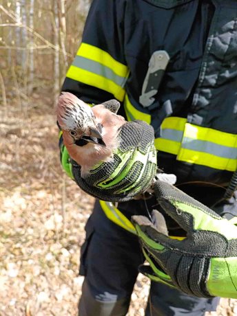 Zraněná sojka byla po zásahu předána pracovníkovi záchranné stanice, kde dostane potřebnou péči a šanci na návrat do volné přírody.