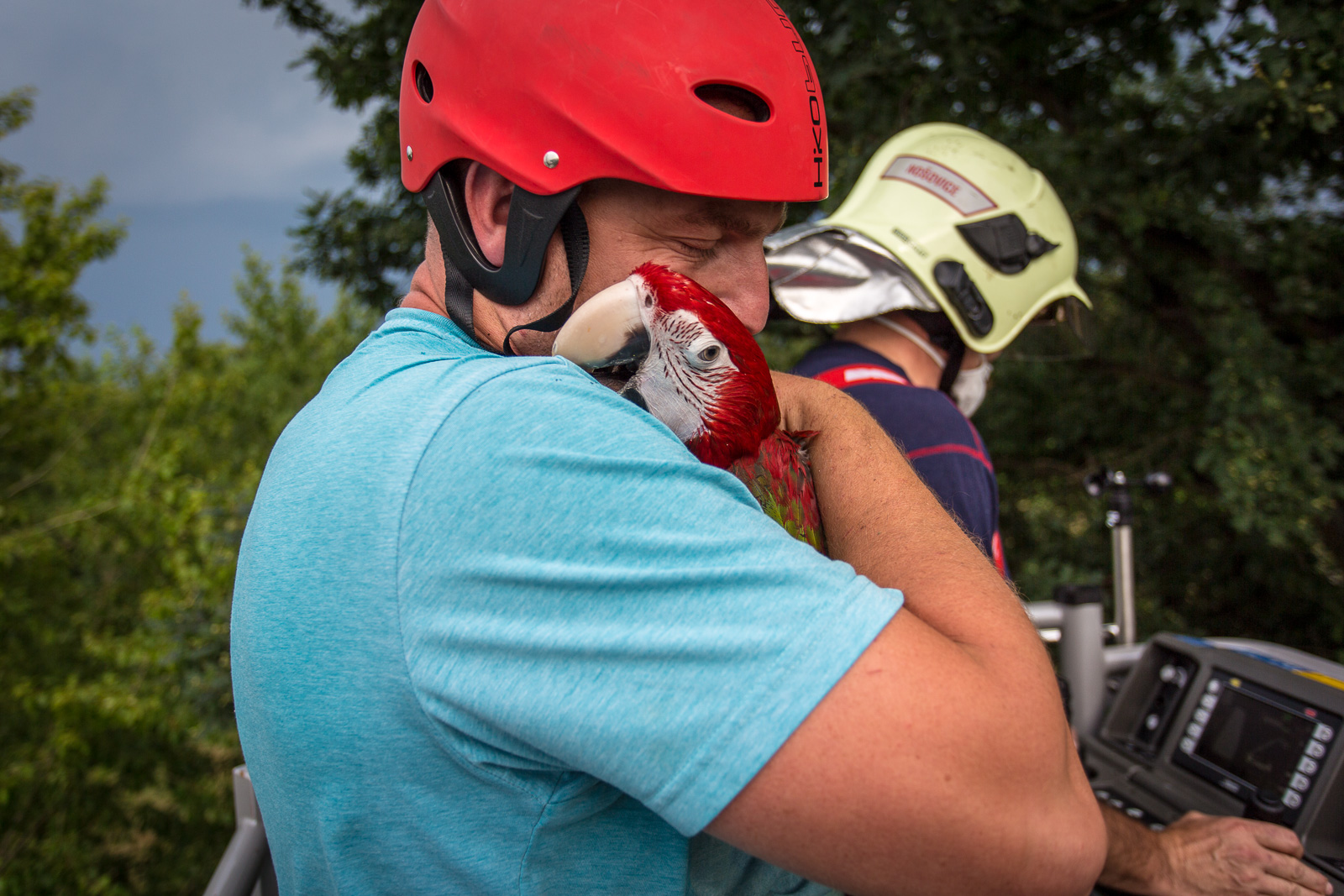 Maliteli se podařilo papouška bez komplikací zachytit za zbytek utrženého provázku a vzít pevně do náruče. Sjet s plošinou zpět na pevnou zem pak byla pro hasiče už jen otázka vteřin.