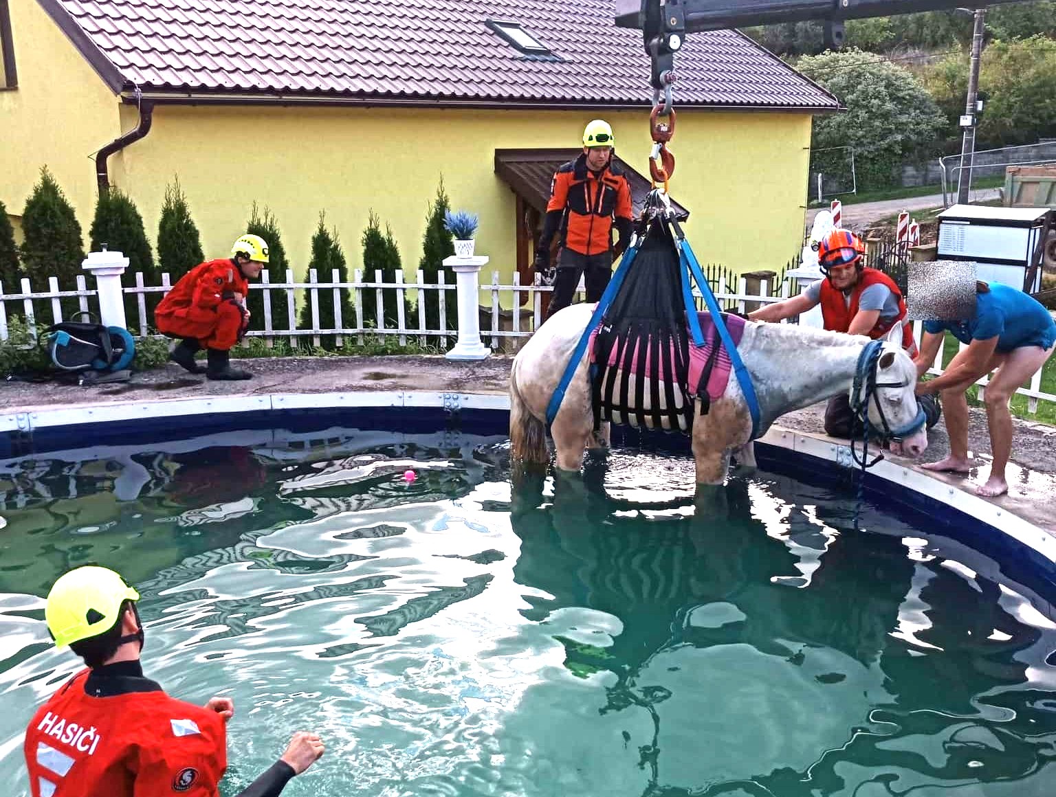 Hasiči zachraňovali koně, který spadl do bazénu. Za pomoci techniky a speciální sítě se podařilo zvíře vyprostit bez zranění.
