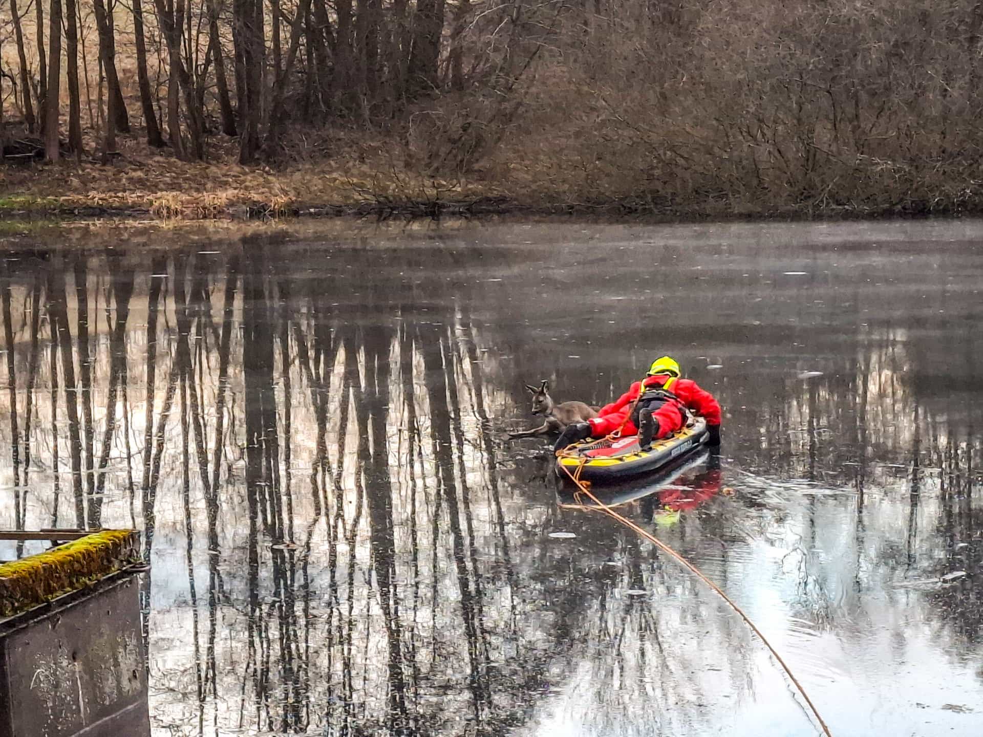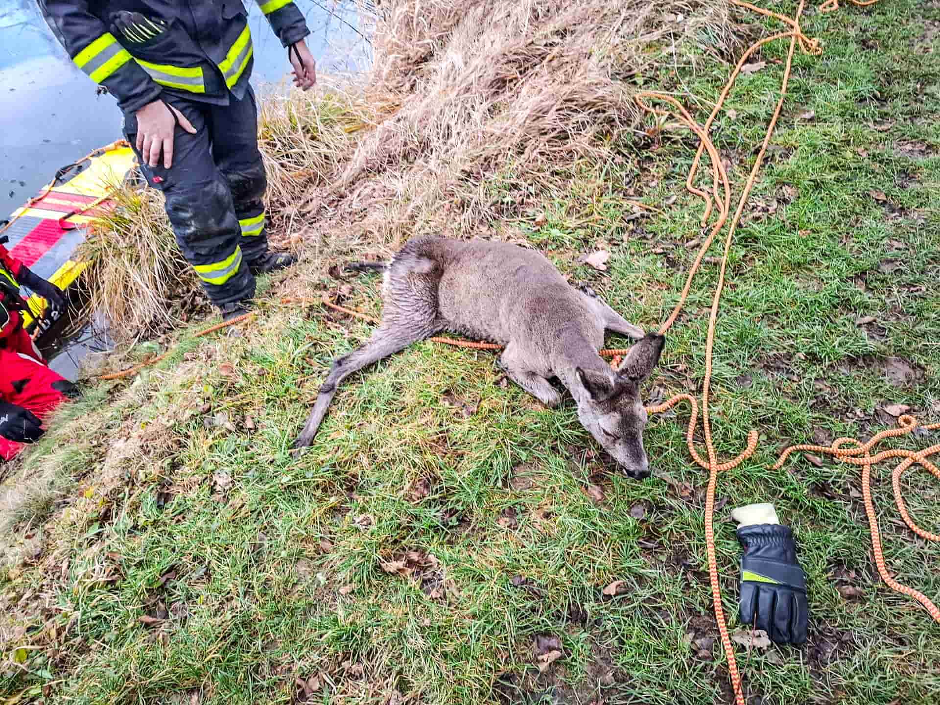 Zásah hasičů na zamrzlé vodní hladině zabránil tragédii. Srna se kvůli tenkému ledu nedokázala dostat ke břehu. Pomocí speciálního vybavení ji hasiči bezpečně zachránili a vypustili zpět do přírody.