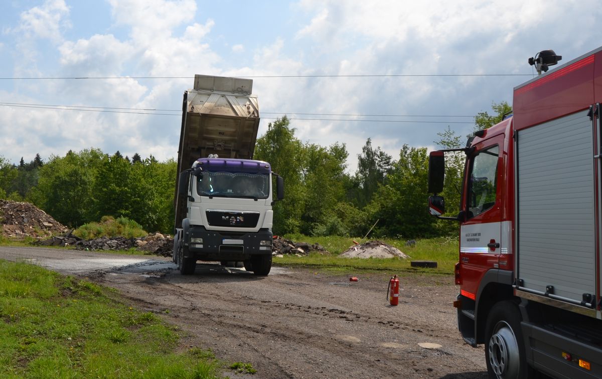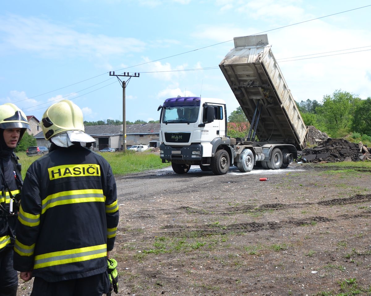 Zvednutá korba nákladního auta se dotkla drátů s vysokým napětím, auto začalo hořet Řidič auta vyvázl bez zranění, podle znalce měl velké štěstí