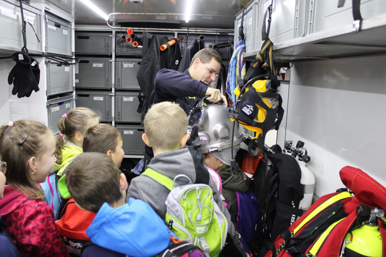 Sednout si za volant hasičské cisterny a omrknout její vybavení, vyzkoušet si dýchací přístroj nebo si osahat výstroj potápěčů a lezců.