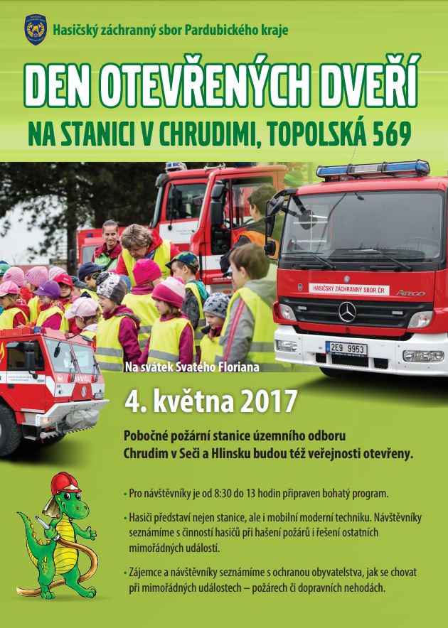 Přijďte na Den otevřených dveří na stanici v Chrudimi. Pobočné stanice v Hlinsku a Seči budou též otevřeny. Pro návštěvníky je na svátek sv. Floriana 4. května 2017 od 8.30 hodin do 13 hodin připraven bohatý program. Představíme Vám nejen moderní techniku, ale seznámíme Vás také s činností hasičů při hašení požárů i při řešení ostatních mimořádných událostí. Povíme si, jak se máme chovat při mimořádné událostí, mezi které patří jak požáry, tak dopravní nehody.