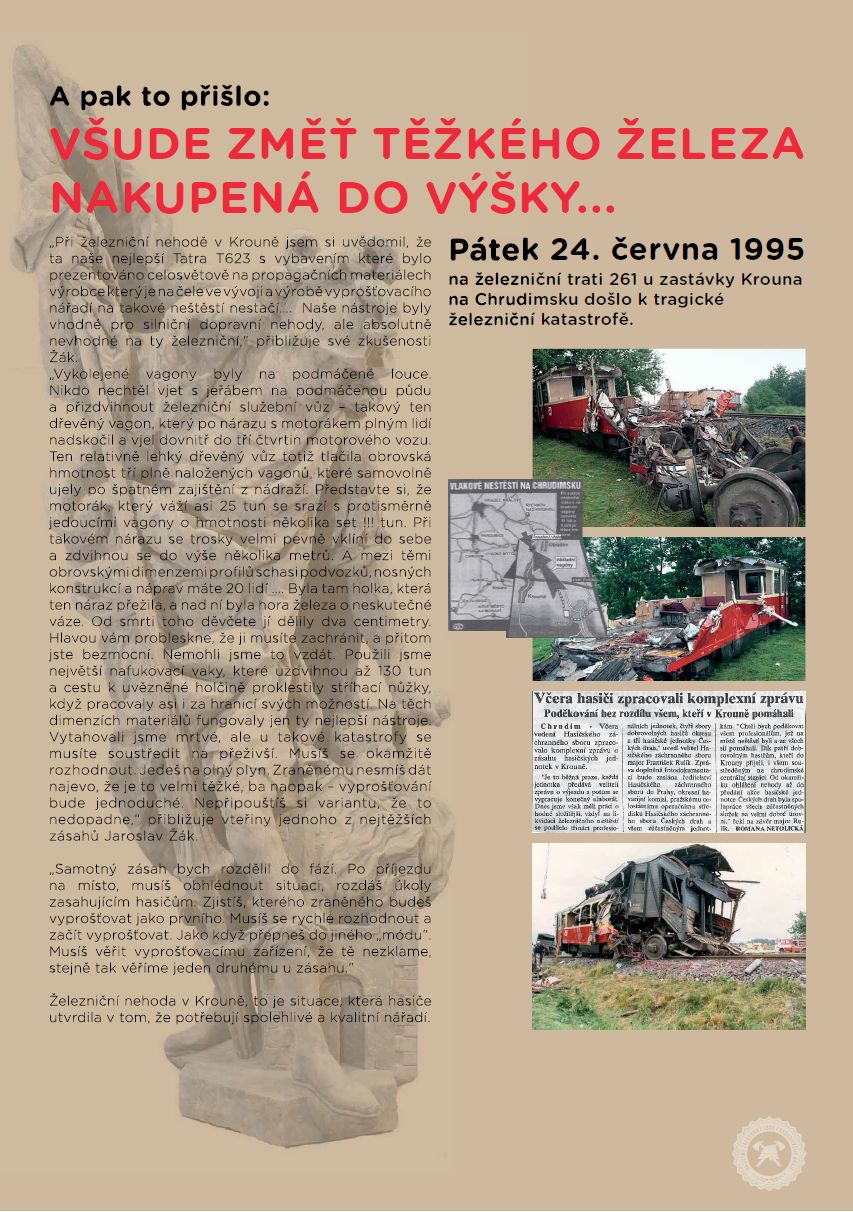 Ve Státním archivu Pardubice je tak možné spatřit historicky první vyprošťovací nářadí, které hasiči použili například při nejtragičtější železniční nehodě v Krouně (a nejtragičtější železniční nehodě v České republice. Vyprošťování u dopravních nehod je vysoce specifickou činností. Jedinými, kdo tyto speciální záchranné činnosti vykonávají, jsou právě hasiči. Výstava o vyprošťování není o umění jako takovém, ale o poslání pomoci lidem v nouzi.