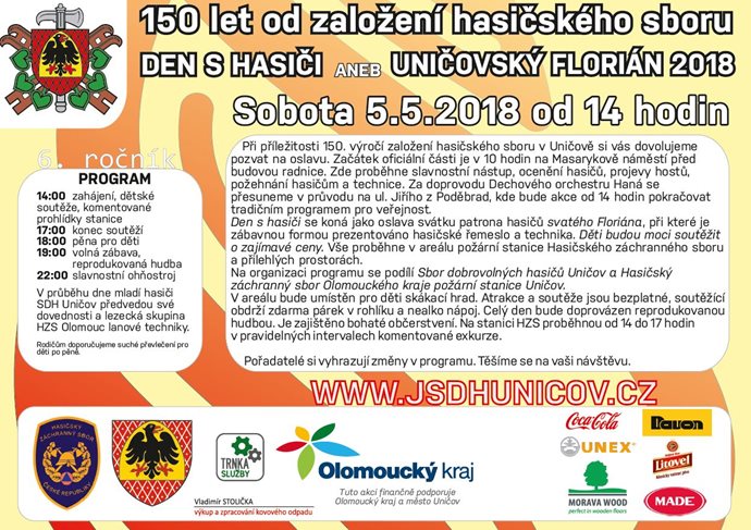 V sobotu 5. května 2018 se od 14 hodin koná v Uničově již tradiční akce nejen pro děti "Uničovský Florián 2018" aneb Den s hasiči. Při této příležitosti proběhnou oslavy 150 let od založení uničovského dobrovolného sboru.