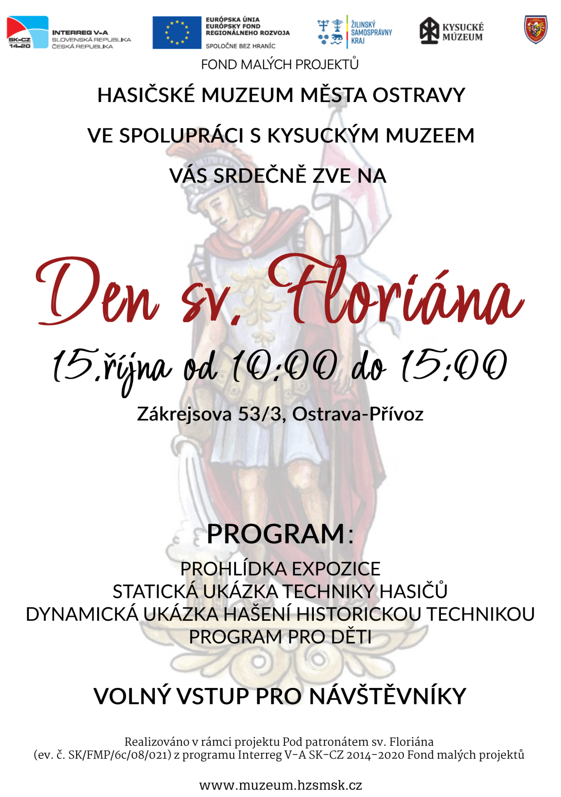 Hasičský záchranný sbor Moravskoslezského kraje (HZS MSK) pořádá ve spolupráci s Kysuckým muzeem v Čadci v sobotu 15.10.2022 od 10 do 15 hodin v prostorách Hasičského muzea města Ostrava akci s názvem „Den sv. Floriána“. Návštěvníci mají vstup zdarma.