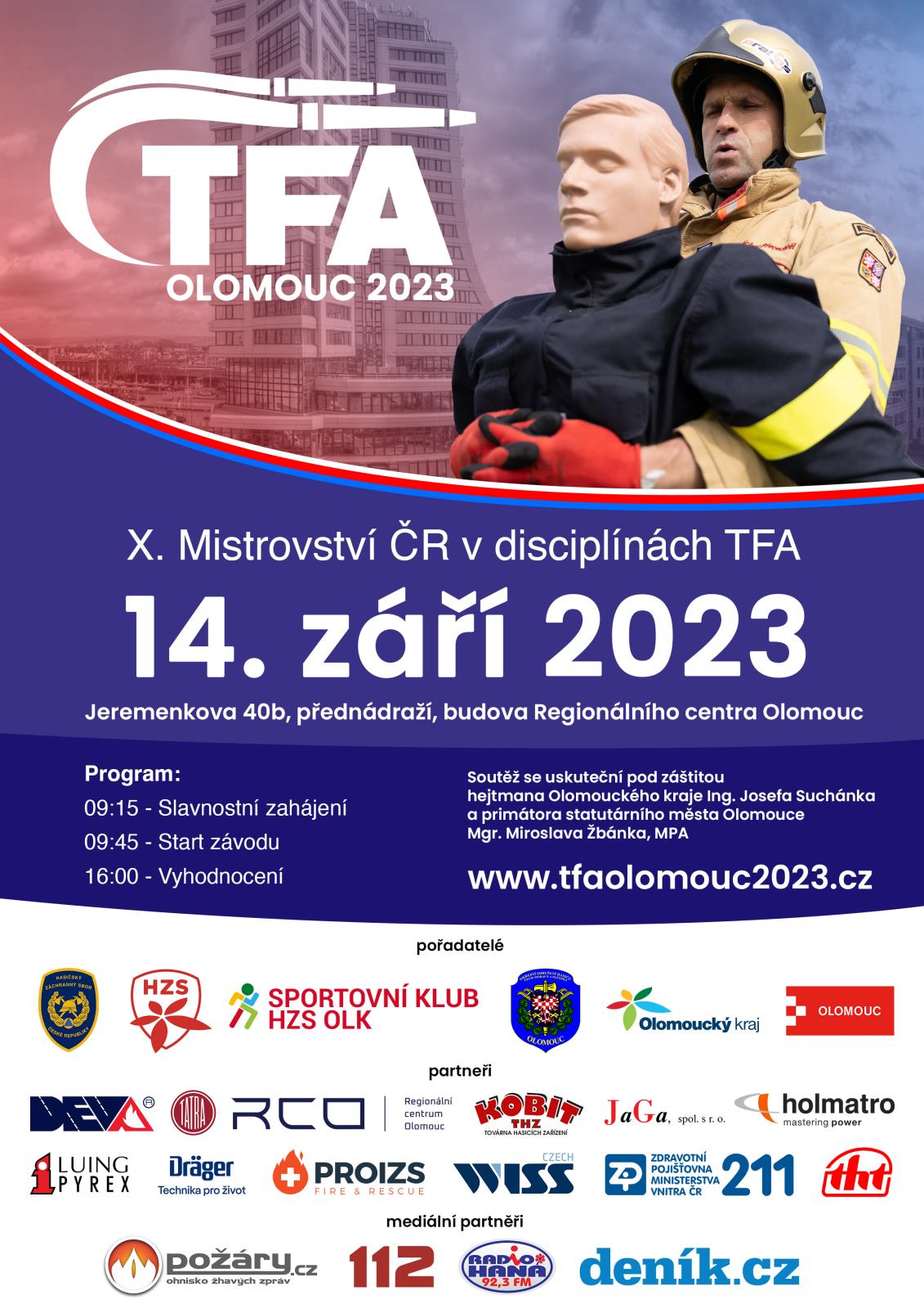TFA Olomouc 2023 pořádá MV-GŘ HZS ČR spolu s HZS Olomouckého kraje a Sportovním klubem při HZS Olomouckého kraje. Tímto děkujeme za sponzorské dary partnerům soutěže, bez jejichž příspěvku by bylo velmi obtížné takto rozsáhlou soutěž organizovat.