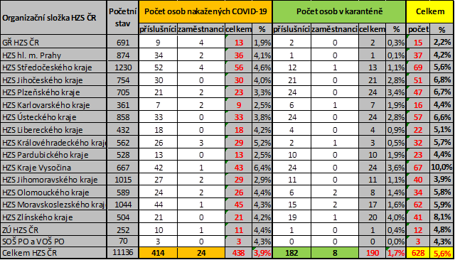2. 11. 2020 (RK) - HZS ČR eviduje v k dnešnímu dni 438 COVID–19 pozitivních příslušníků a zaměstnanců, a 190 jich je v karanténě. Celkově se jedná o cca 5,6 % našeho sboru. Podrobněji viz přiložená tabulka.