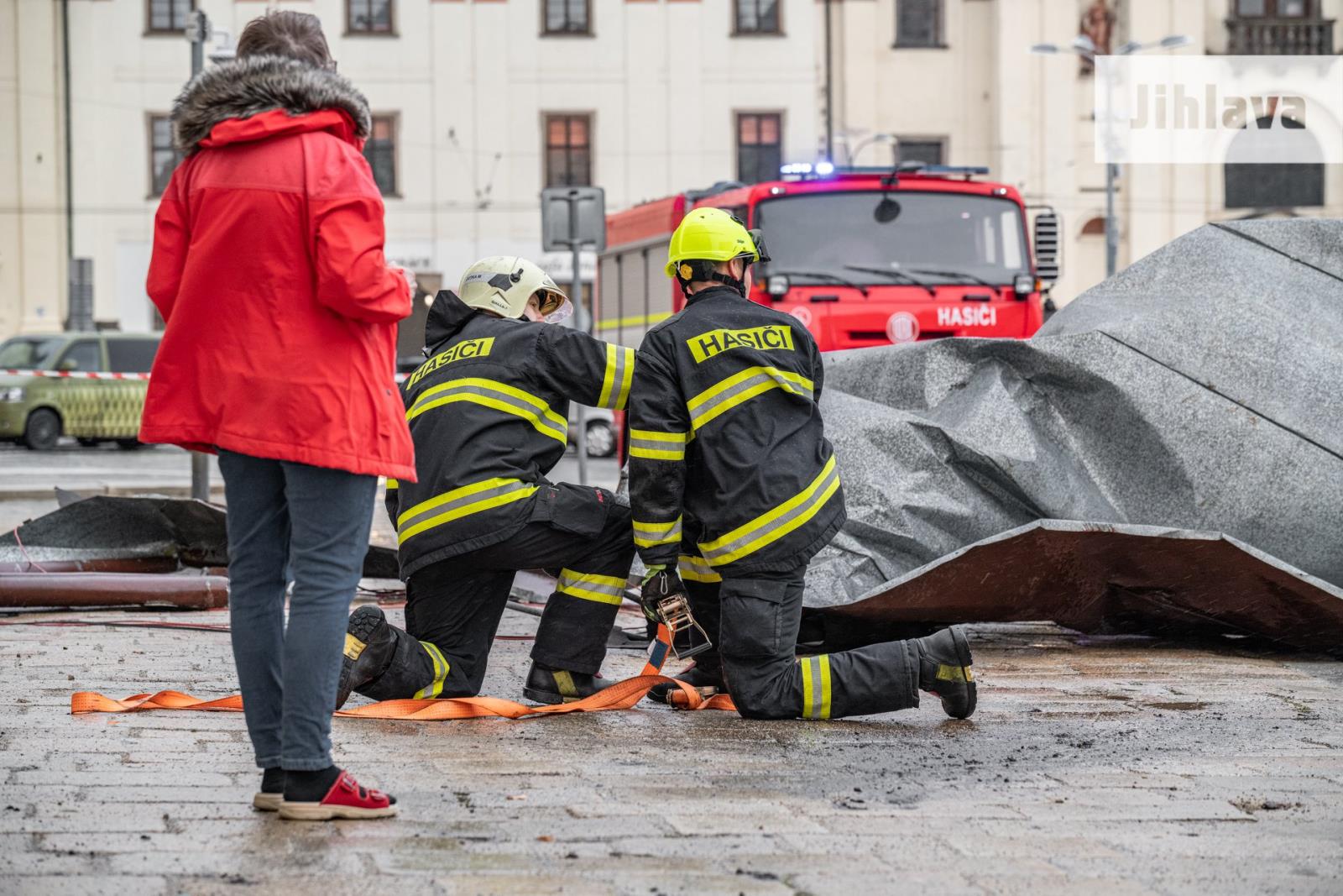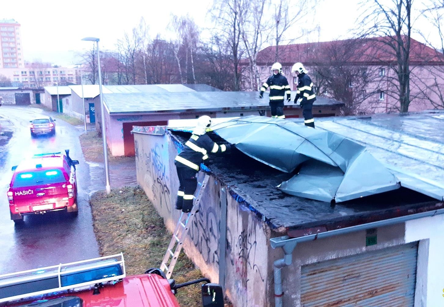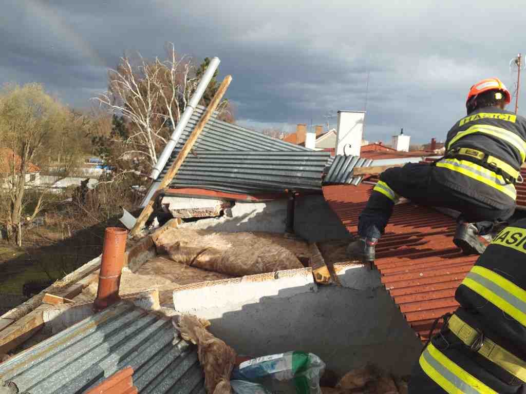Uvolněné střešní krytiny hasiči zajišťovali v Praze-Suchdole na budově ambasády, na poště v Horních Počernicích a v Loděnicích na Berounsku museli kvůli posunuté střeše vodojemu evakuovat z vedlejší budovy asi 60 osob.
