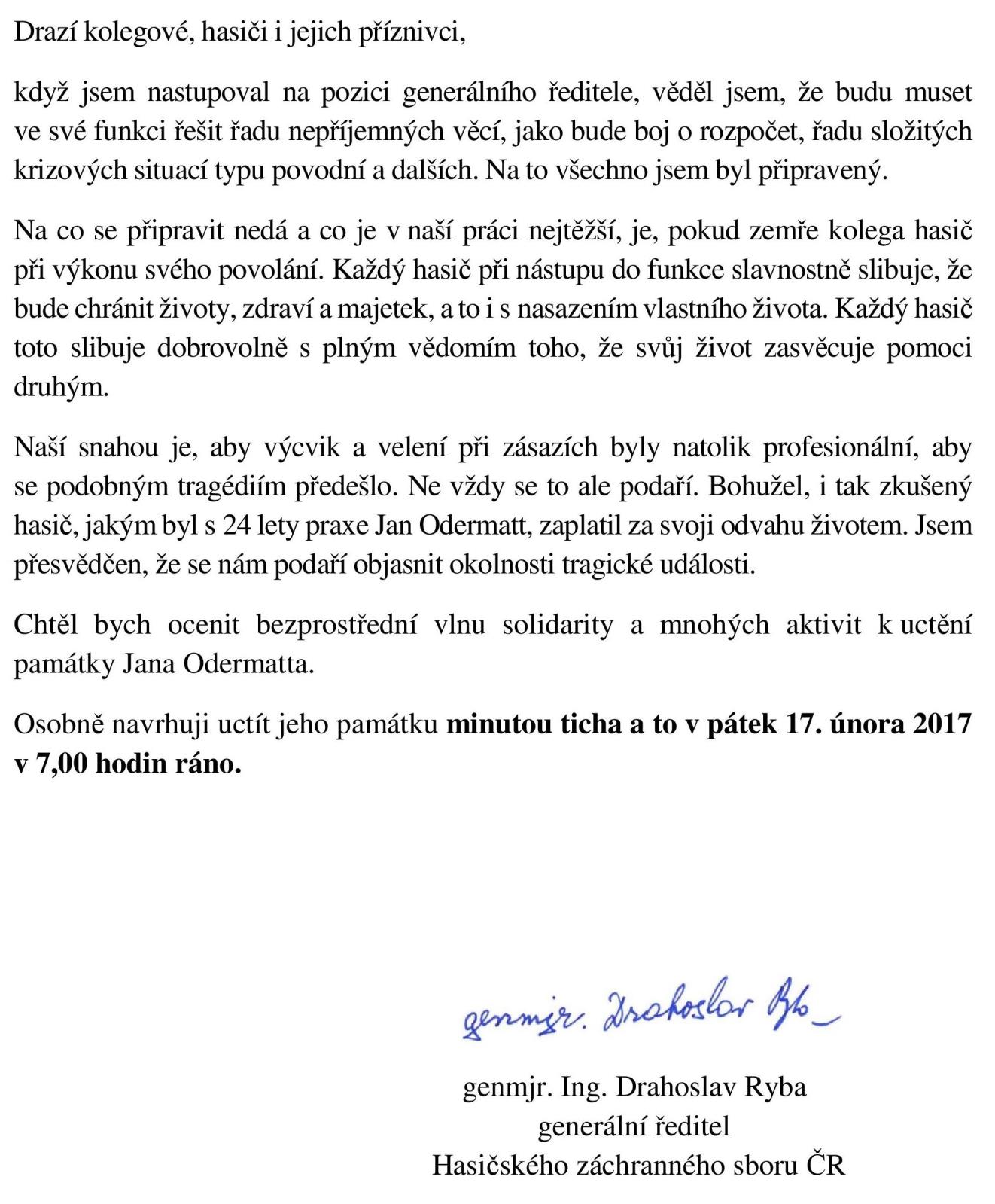 "Osobně navrhuji uctít památku hasiče Jana Ondermatta minutou ticha v pátek 17. února 2017 v 7,00 hodin ráno." říká generální...