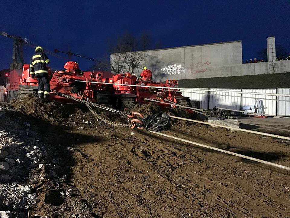 tahače naložené řetězy, které se používají pro úvazy těžkých břemen. Cílem zásahu bylo vytáhnout zbytky lávky v celku z důvodu dalšího policejního vyšetřování.