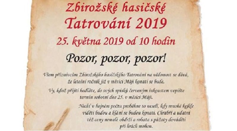 V neděli 26.5.2019 se sešlo více než 2 500 návštěvníků na 9. ročníku Zbirožského hasičského Tatrování, které bylo letos doplněno Dnem otevřených dveří Národní základny humanitární pomoci. Ta má sídlo právně v areálu Hasičského záchranného sboru ČR ve Zbirohu. Již tak bohatý program byl navíc doplněn soutěžemi a aktivitami, které připravilo Ministerstvo pro místní rozvoj.