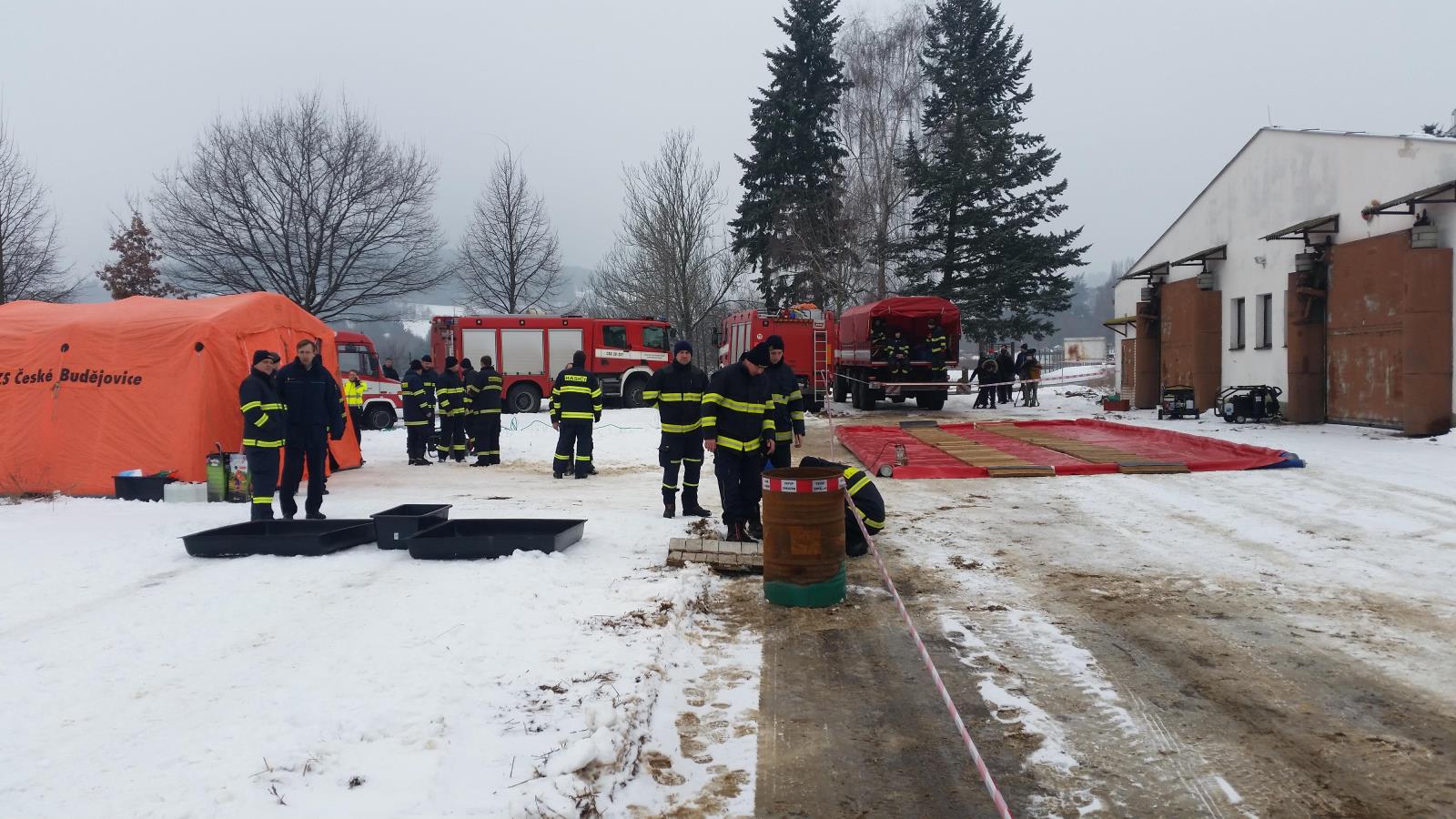 Veškerá vyslaná hasičská technika se do Vlachova Březí dostavila již v dopoledních hodinách. Následovala stavba dekontaminační linky a stanů pro týlové zabezpečení.
