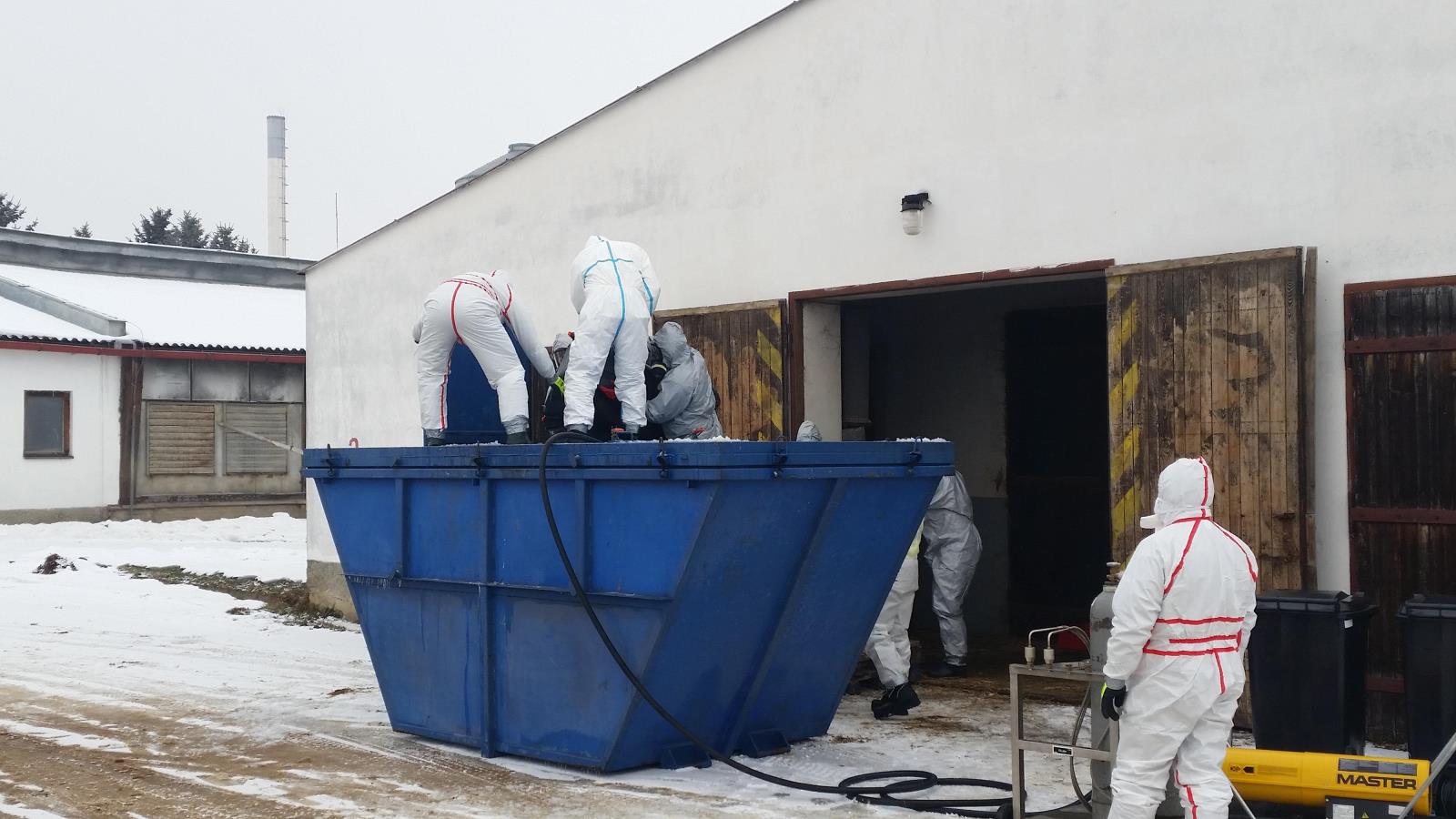 Úkolem jednotek HZS Jihočeského kraje byl sběr a naložení všech kachen do připravených kontejnerů. Přímo v ohnisku se pohybovalo 12 hasičů vybavených ochrannými obleky, respirátory, rukavicemi a holínkami přilepenými izolačními páskami k oblekům. Stejně zajištěni byli i pracovníci KVS, kteří do vytýčeného nebezpečného prostoru vstupovali společně s hasiči. Ve stanech týlového zabezpečení byli stále připravena další dvanáctka stejně vybavených hasičů, kteří střídali své kolegy. Každý z hasičů, který ukončil zásah v nebezpečné zóně, musel projít osobní dekontaminací, tzn. vše, co měl v zóně na sobě, musel svléknout a uložit do pytle (jednorázové ochranné obleky a filtry z masek jsou likvidovány, maska holiny a rukavice se dekontaminují) a teprve pak se mohl obléknout do svého běžného zásahového obleku a opustit zónu.