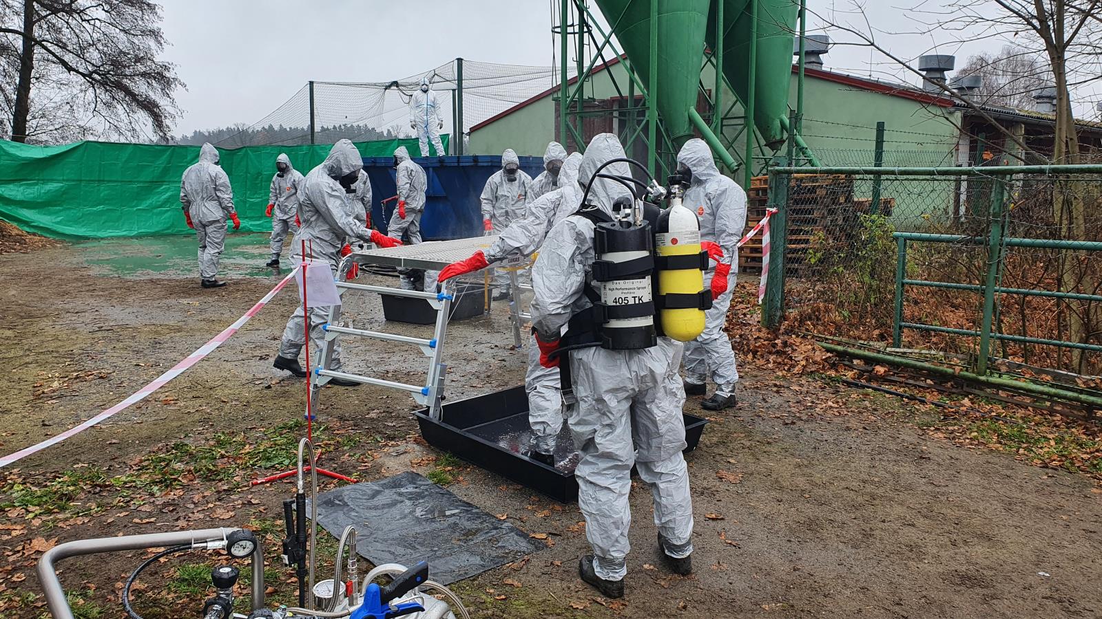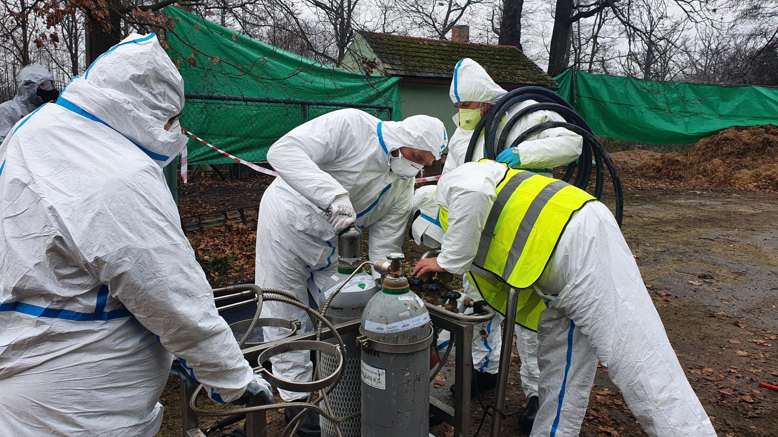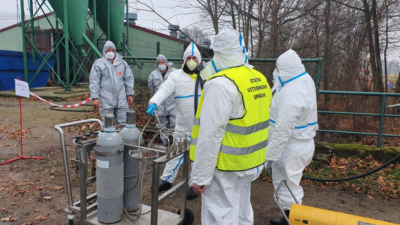 Krátce po 12. hodině byly kontejnery s usmrcenými husami naloženy na nákladní vozy. Aby vozy mohly opustit nebezpečný prostor a mohly odjet do kafilerie, musely také projít dekontaminací.