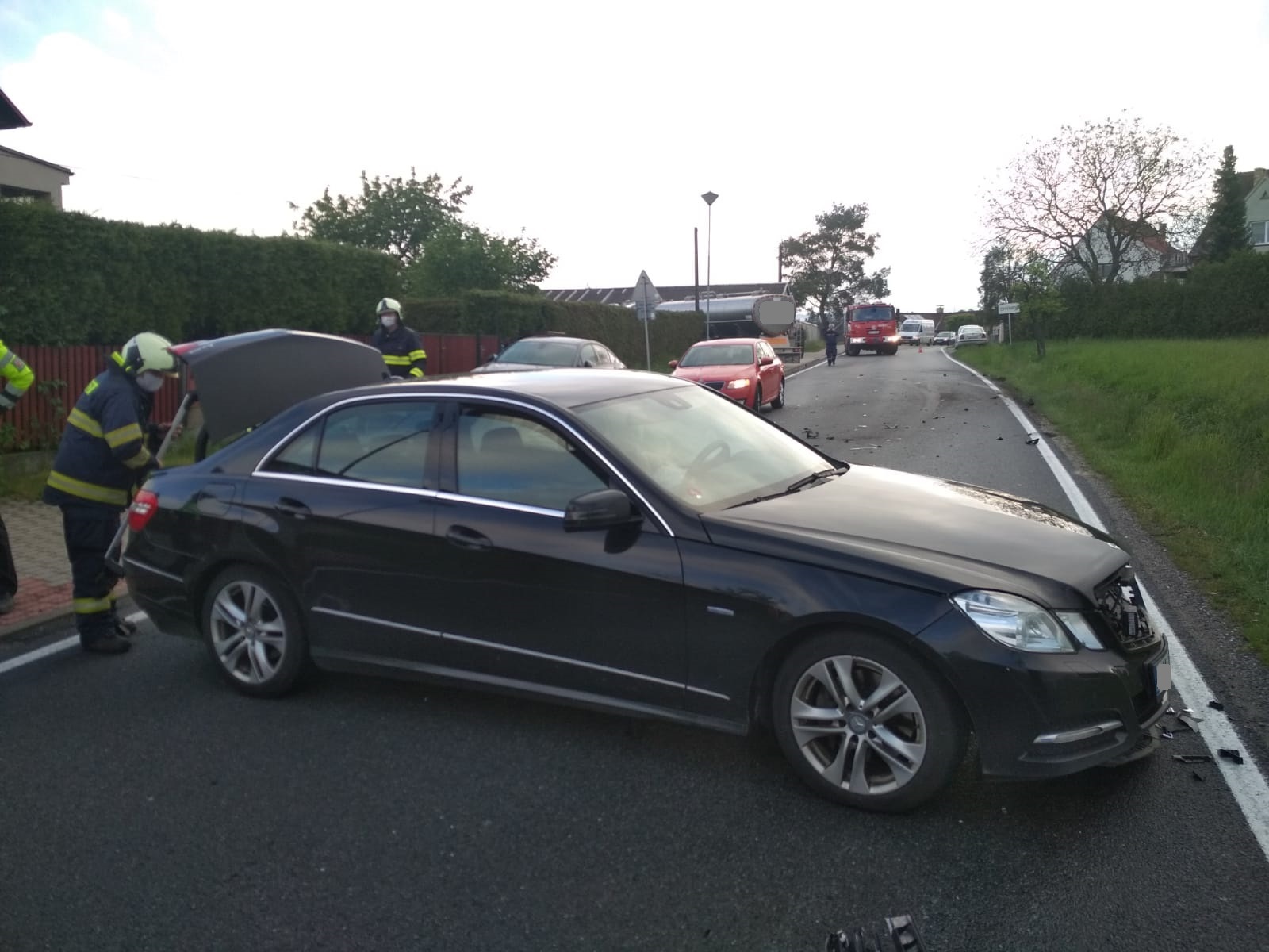 Po průzkumu na místě nehody velitel podal zprávu, že se jedná o střet osobního auta značky Mercedes Benz a cisterny s vlekem převážející mléko. Po střetu Mercedes zůstal o kus dál na silnici. Cisterna vyjela ze silnice, překonala plot soukromé zahrady a skončila jen asi metr a půl od rodinného domu. Oba řidiči vyvázli zcela bez zranění. Zasahující hasiči zajistili místo nehody, následně zabezpečili havarované vozy protipožárním opatřením a provedli kontrolu úniku provozních kapalin.