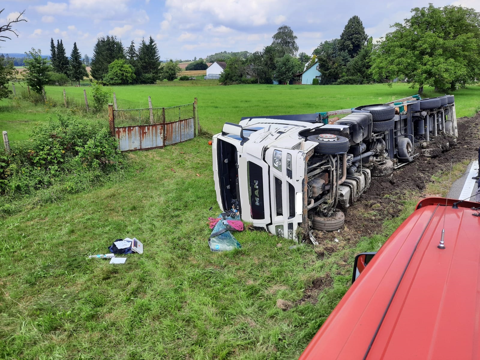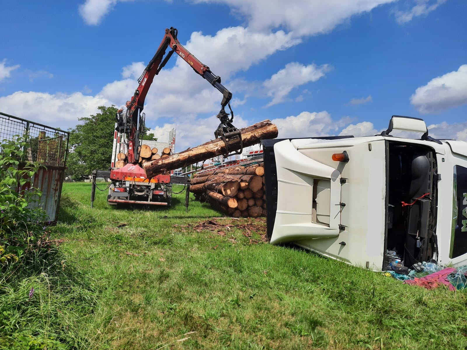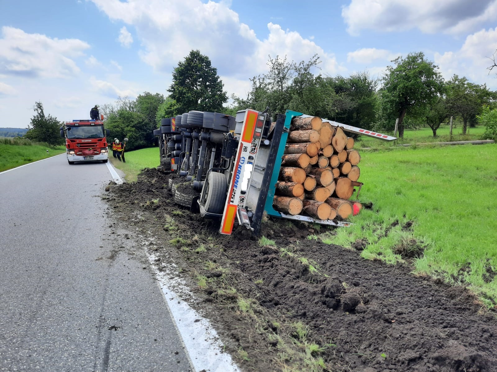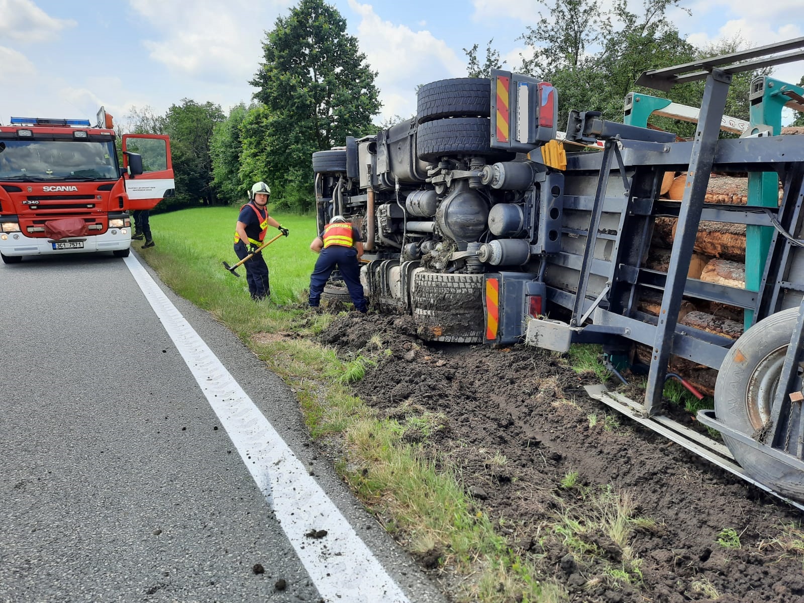 Kamión, převážející přibližně 40 m3 dřeva ve čtyřmetrových délkách, skončil převrácený na bok v příkopu, jeho řidič vyváznul bez zraněn. Hasiči dalším průzkumem zjistili, že z nádrží nevytékají žádné provozní kapaliny. Policie ČR silnici v místě nehody zcela uzavřela a stanovila objízdnou trasu. Řidič kamiónu si mezitím objednal náhradní vozidlo a také vůz s hydraulickou rukou pro přeložení nákladu. Po ukončení překládky se k nehodě dostavilo auto odtahové služby s vyprošťovacími jeřáby. Hasiči před zahájením vyproštění preventivně obsypali sorbentem palivové nádrže. Když stál kamión znovu na kolech na silnici, hasiči zametli z vozovky nahrnutou zeminu. Nehodu šetřila Policie ČR.
