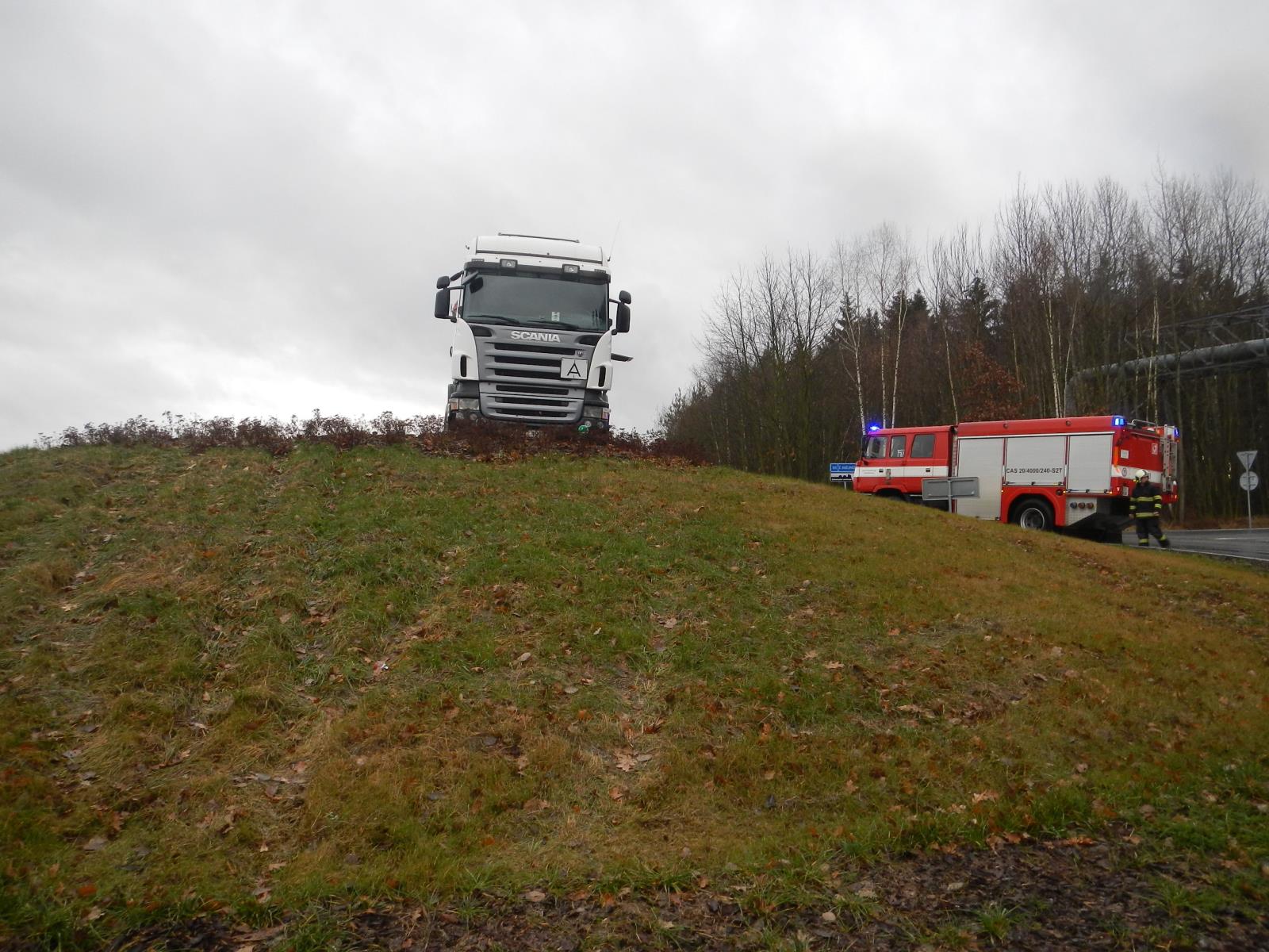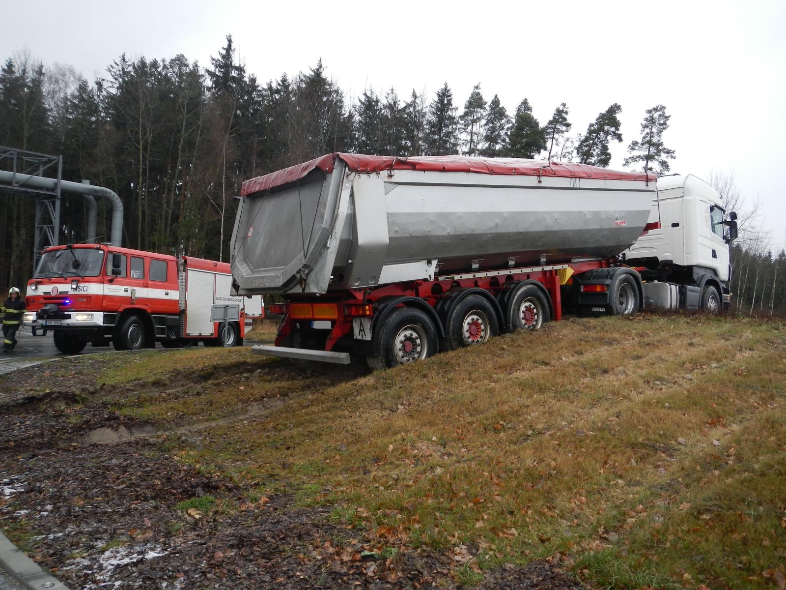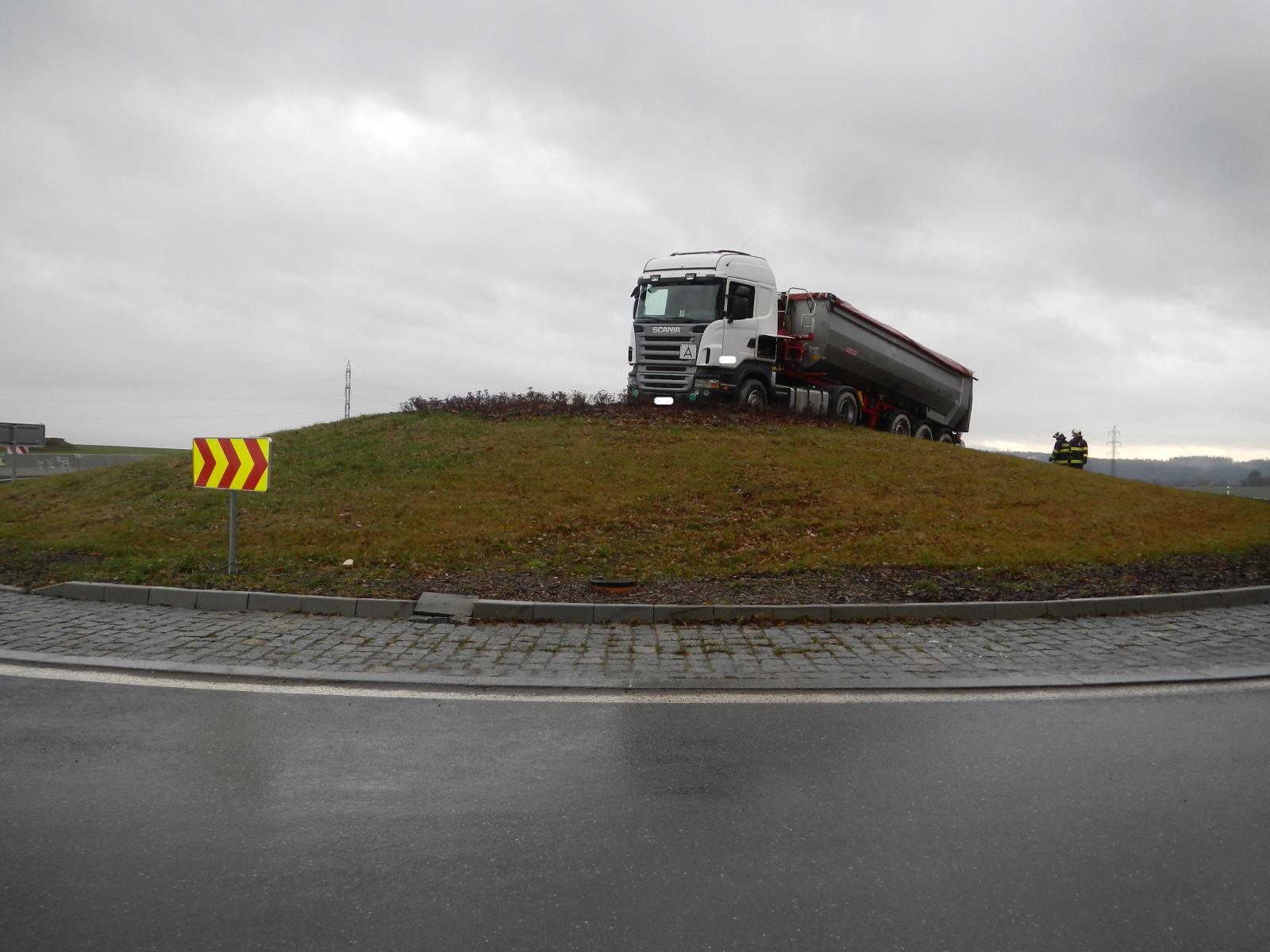 Týnem nad Vltavou ve směru na České Budějovice. Když hasiči k nehodě přijeli, stál tahač s velkoobjemovou vanou naloženou papírovou drtí o celkové váze přibližně 40 tun uprostřed objezdu na vyvýšené travnaté ploše.