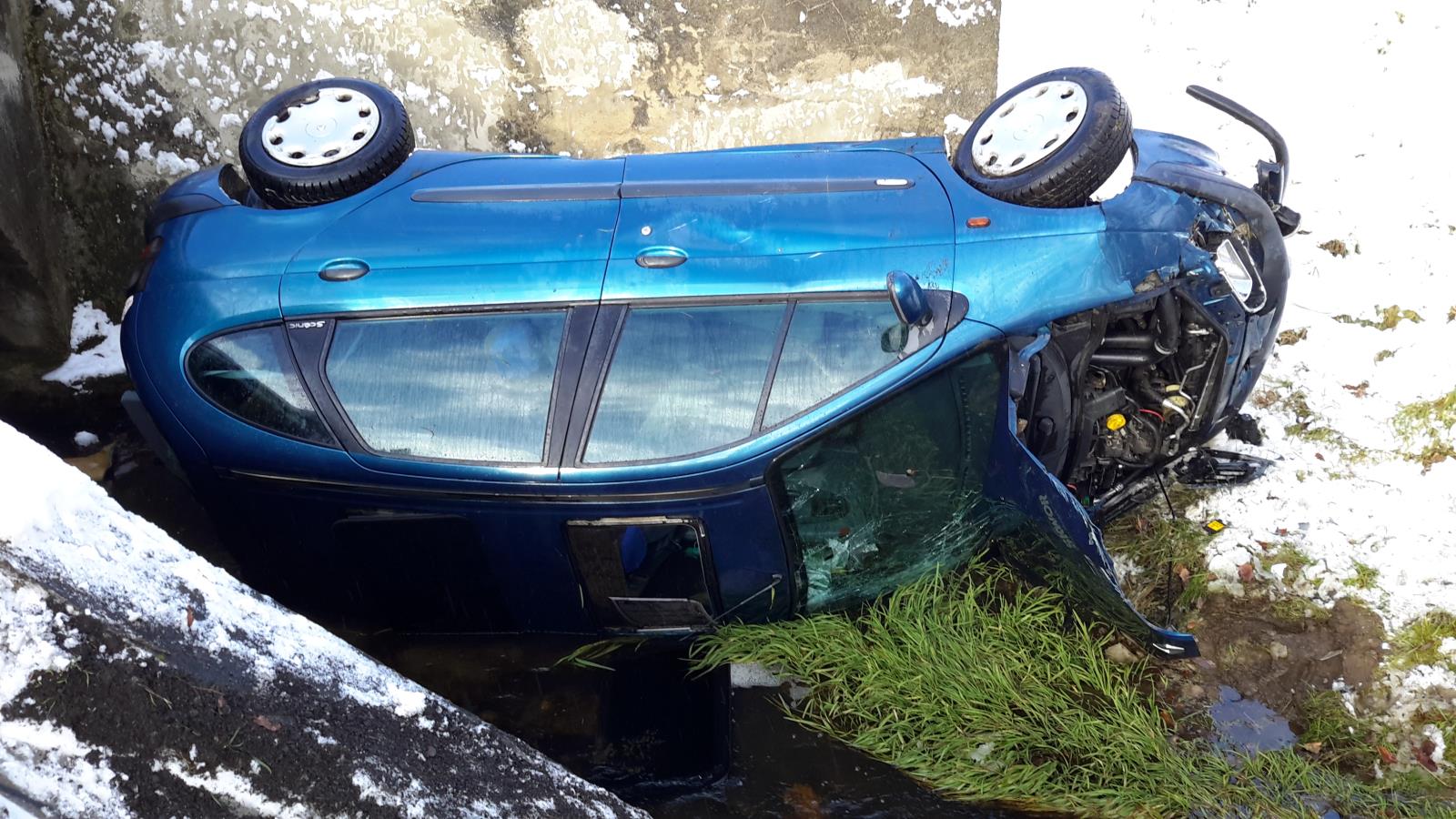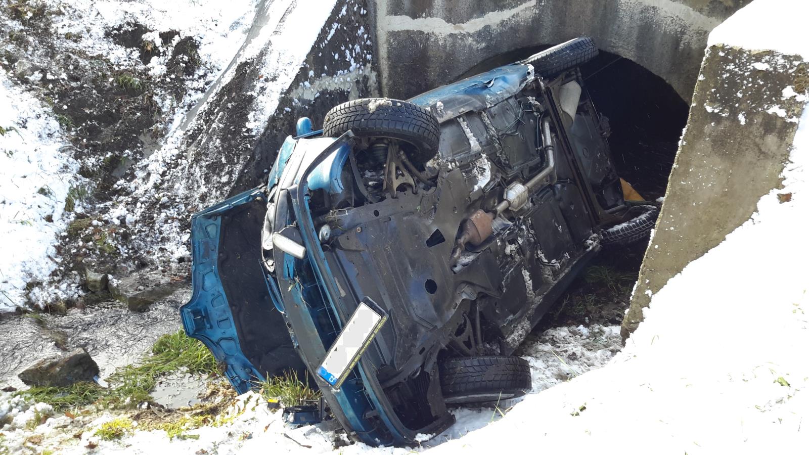 Chvalšin, části obce Červený Dvůr. Zde osobní auto vyjelo ze silnice a skončilo převrácené v místním potoce.