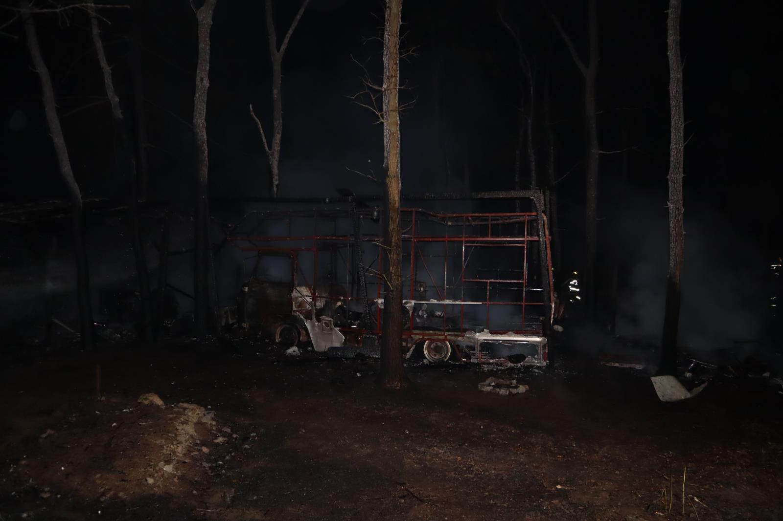 Podle původního ohlášení na tísňovou linku hořely tři obytné karavany. Požár se ale rychle rozšířil na další obytné vozy a také blízký les. Hasiči nakonec likvidovali požár 11 karavanů, jednoho obytného vozu značky Avia a osobního auta značky Škoda Yeti. Požár zasáhnul les na ploše přibližně 70 x 70 metrů.