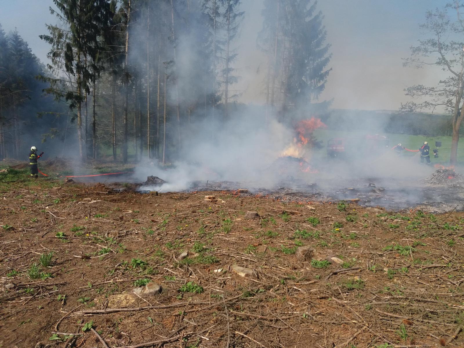 Hnojné Lhoty, kde hořela hrabanka, kles a pařezy po těžbě. Veškerý porost v době příjezdu hasičů hořel na ploše přibližně 1 000 m