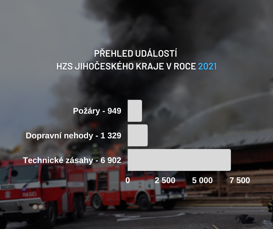 Poznámka: Prezentovány jsou předběžné základní statistické informace o událostech se zásahem jednotek požární ochrany a požárech v roce 2021. Konečné počty zásahů včetně dalších informací budou publikovány ve Statistické ročence HZS Jihočeského kraje za rok 2021, která bude k dispozici v následujících týdnech a se kterou Vás samozřejmě seznámíme.
