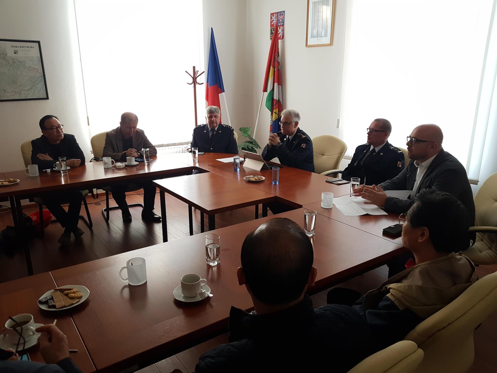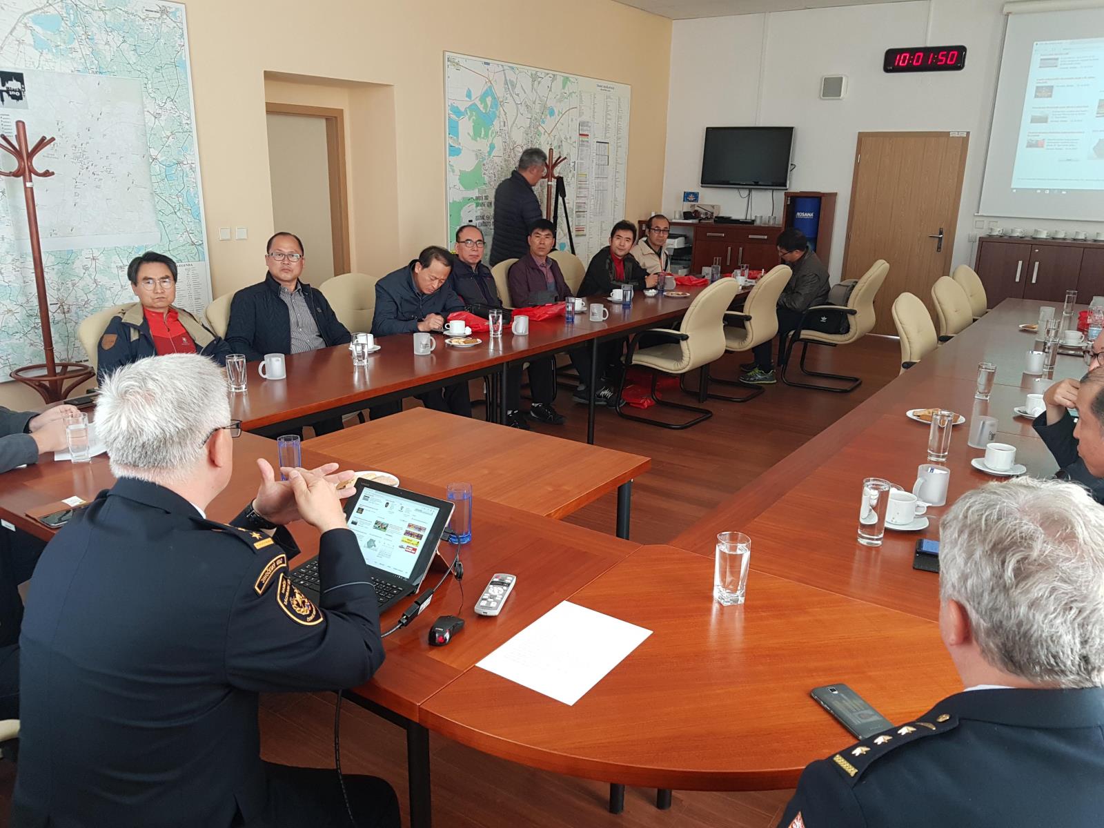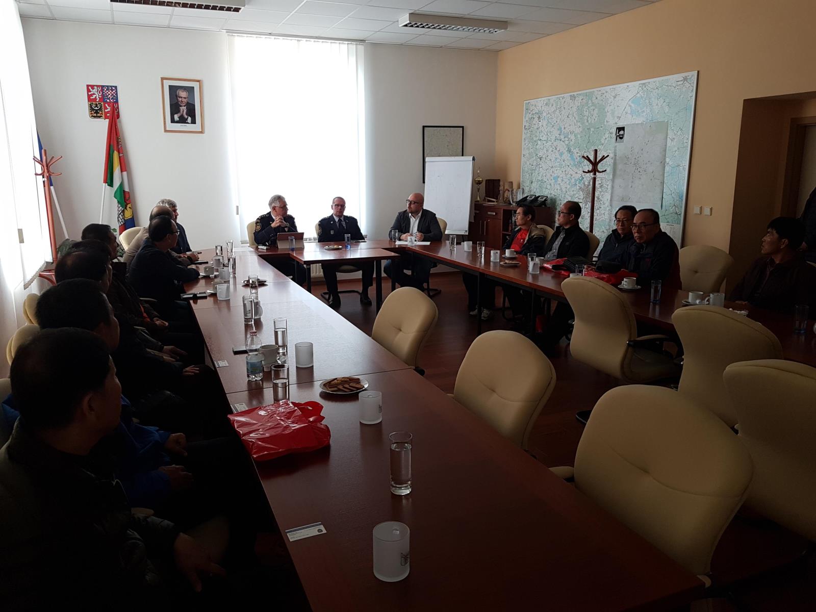 Ředitel jihočeského profesionálního sboru nejprve přijal hosty v zasedací místnosti krajského ředitelství, kde jim prezentoval základní informace o HZS Jihočeského kraje, o integrovaném záchranném systému České republiky, o fungování spolupráce hasičů nejen mezi kraji, ale také mezi sousedními zeměmi, o systému tísňového volání, operačním řízení či statistice výjezdů. Na jeho prezentaci navázali hosté celou řadou dotazů, došlo na velmi zajímavou diskuzi.