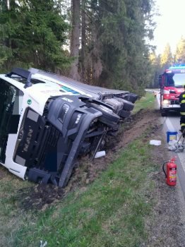 Náraz po střetu se zvěří způsobil převrácení nákladního vozidla