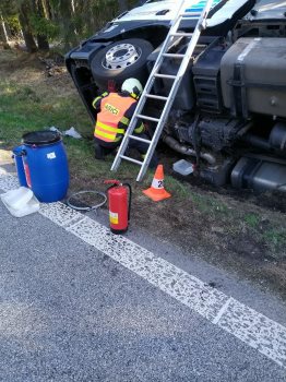 Ranní nehoda na silnici první třídy si vyžádala zásah hasičů po střetu osobního vozu se zvěří a následném nárazu do nákladního automobilu. Situace vedla k převrácení kamionu a úniku provozních kapalin. Komunikace musela být uzavřena.