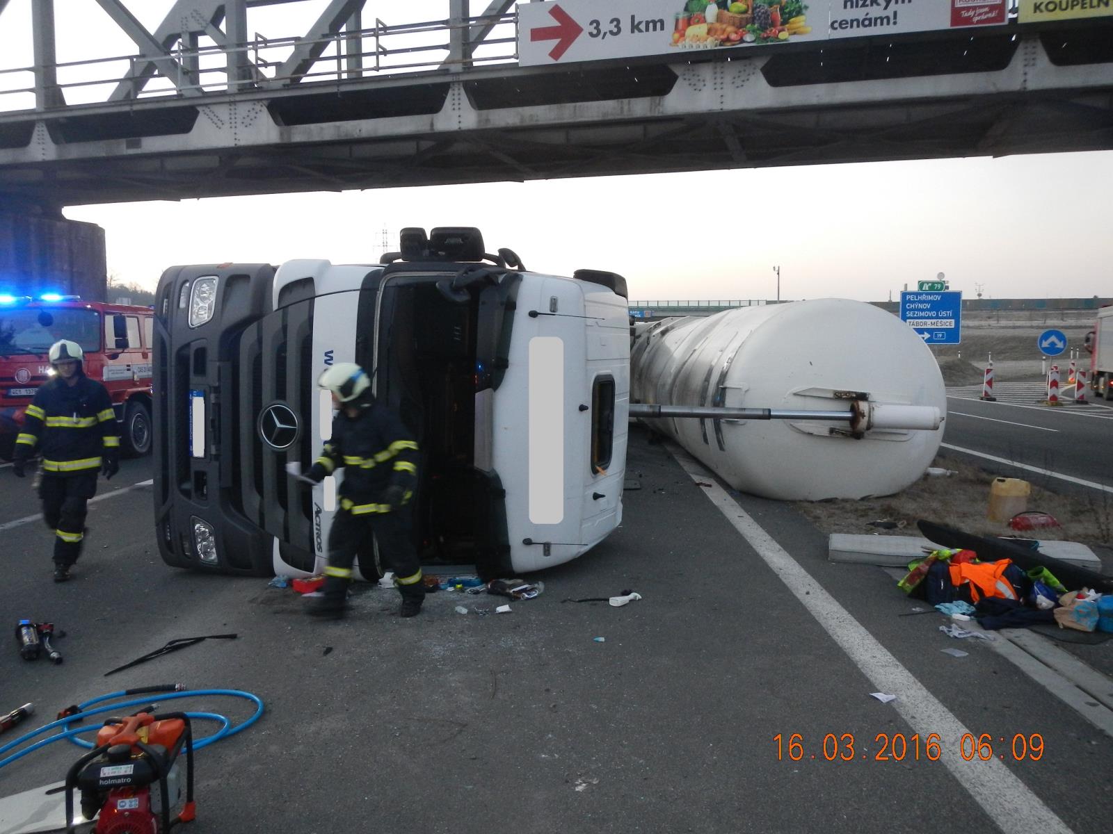 Dnes, 17.března 2017, krátce před šestou hodinou ranní přijalo Operační a informační středisko HZS Jihočeského kraje informaci o dopravní nehodě cisterny, která havarovala u Tábora na dálnici D3.