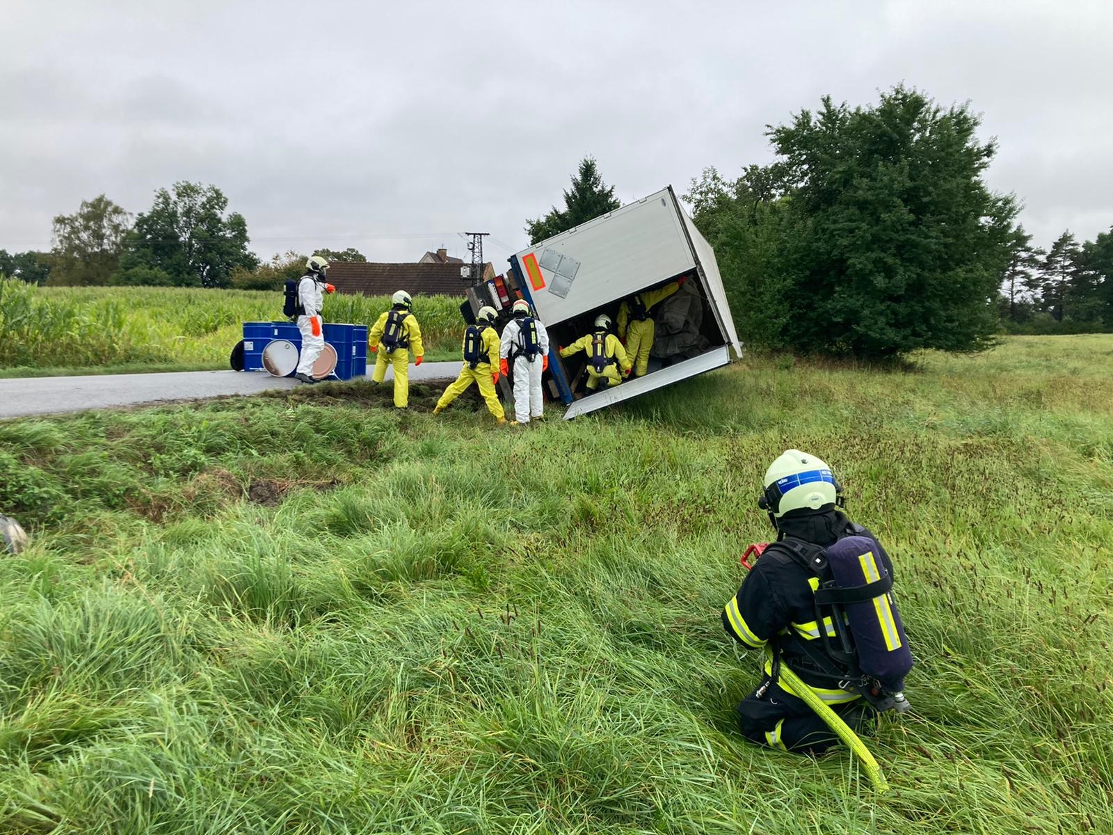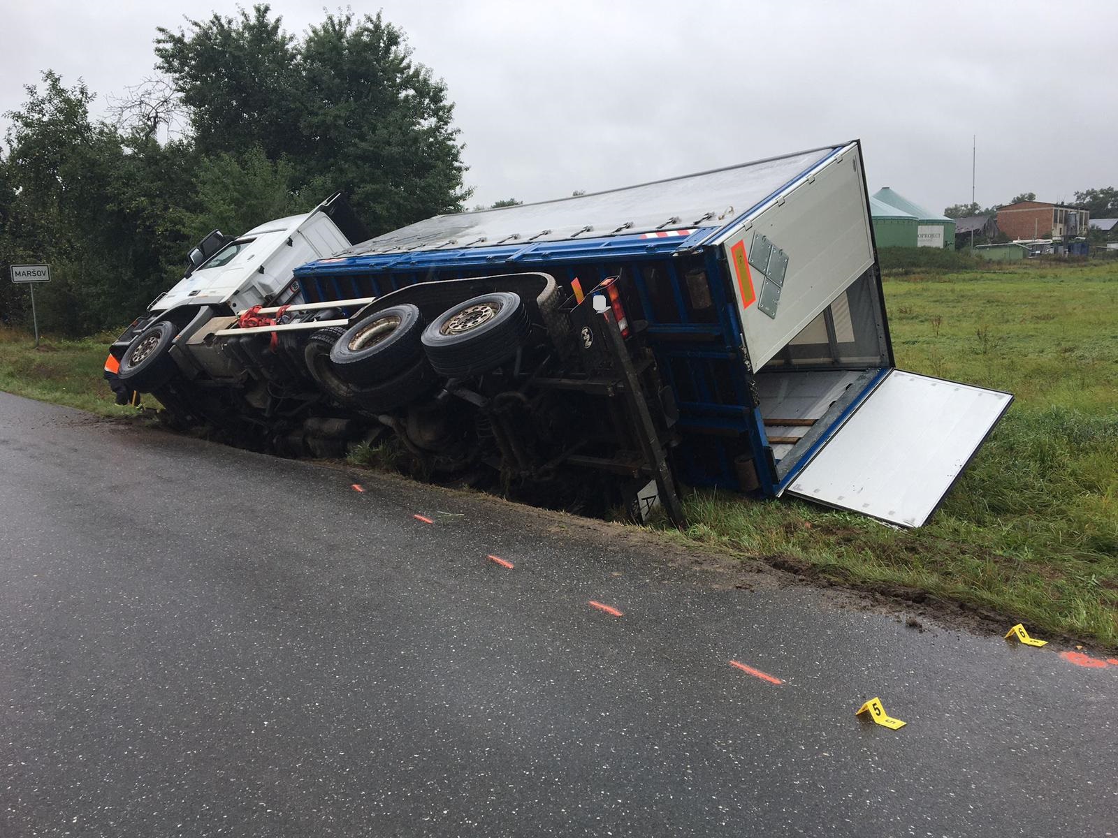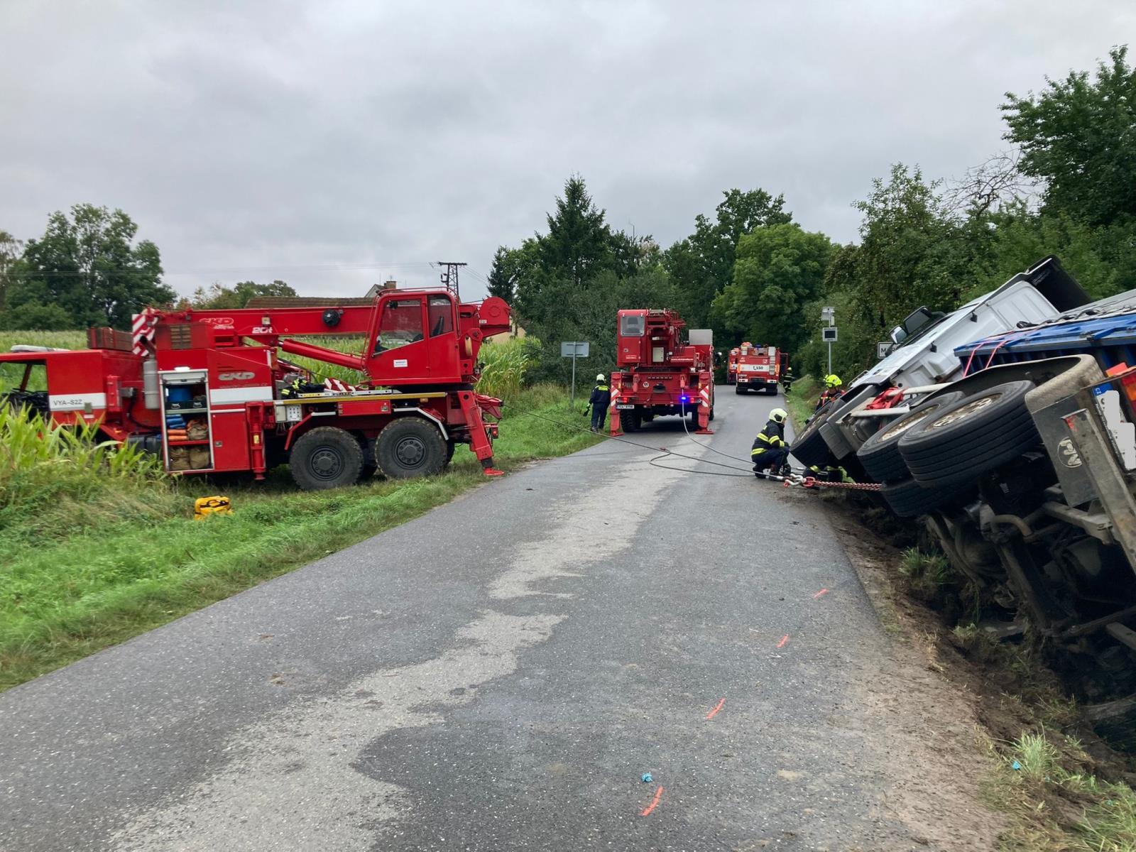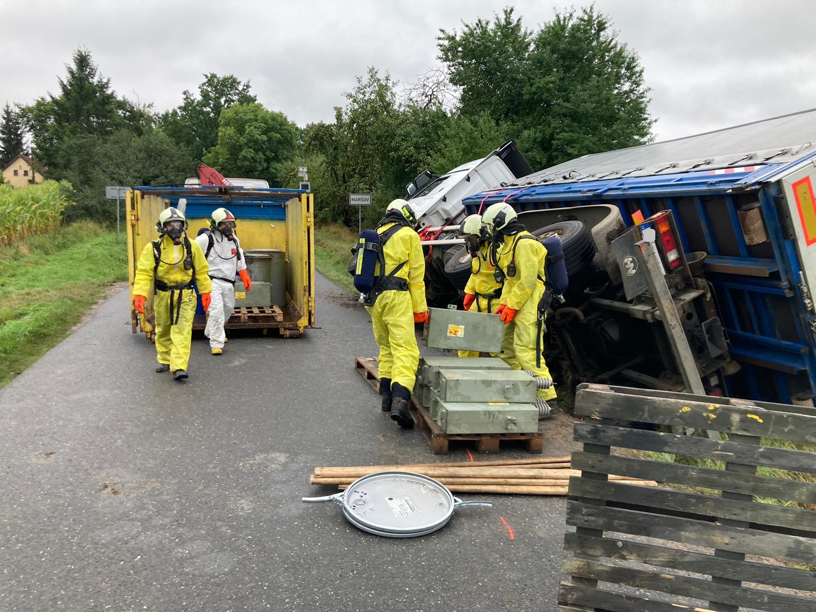 Po průzkumu na místě nehody podal velitel zásahu zprávu, že jde o kontejnerový nákladní automobil, který se převrátil na pravý bok do příkopu. Řidič vozu vyváznul bez zranění, nebyl vyprošťován. V kontejnerech byl převážen xylen (ve čtyřech kubíkových kontejnerech), ředidla a celkem 1,4 tuny baterií s polychlorovaným bifenylem. Hasiči zjistili drobný únik xylenu, který zastavili. Následně pak zahájili překládku nákladu, aby bylo možné auto z příkopu vyprostit. Zásah probíhal v jednorázových protichemických oblecích.