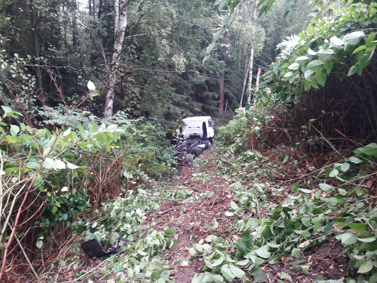 K nehodě vyjeli profesionální hasiči ze stanice Jindřichův Hradec, kteří na místě průzkumem zjistili, že se jedná o nehodu vozu značky Man, jehož tahač sjel ze srázu a zůstal stát na kolech přibližně 20 metrů pod úrovní silnice. Na komunikaci skončila pouze odlomená skříň - mrazák, která zasahovala do obou jízdních pruhů.